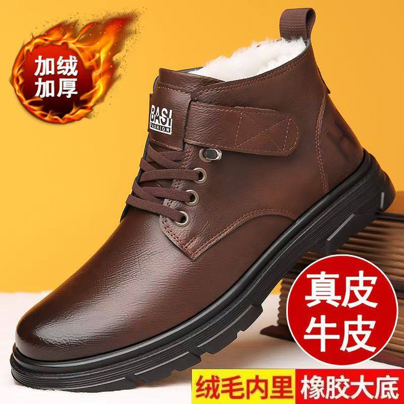 Woodpecker cotton shoes, men's winter leather wool, non-slip high-top casual leather shoes, plush warm, middle-aged and elderly dad shoes