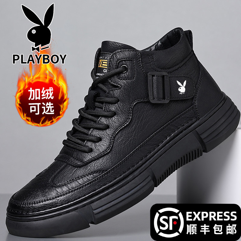 Playboy men's shoes high-top new winter sports and casual leather shoes soft sole fleece warm leather Martin boots for men
