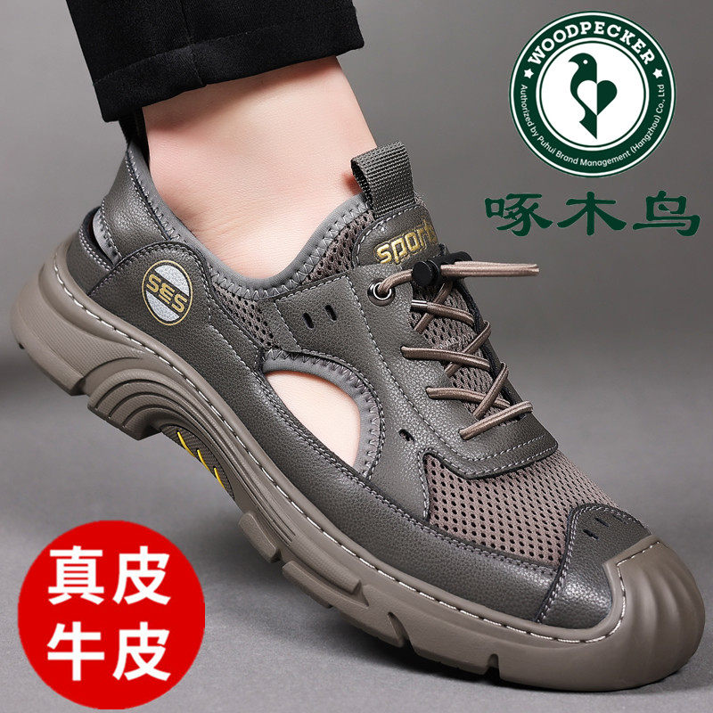 Woodpecker leather sandals, men's soft soles, casual shoes, men's trends, versatile, Vietnamese sandals, men's hole shoes
