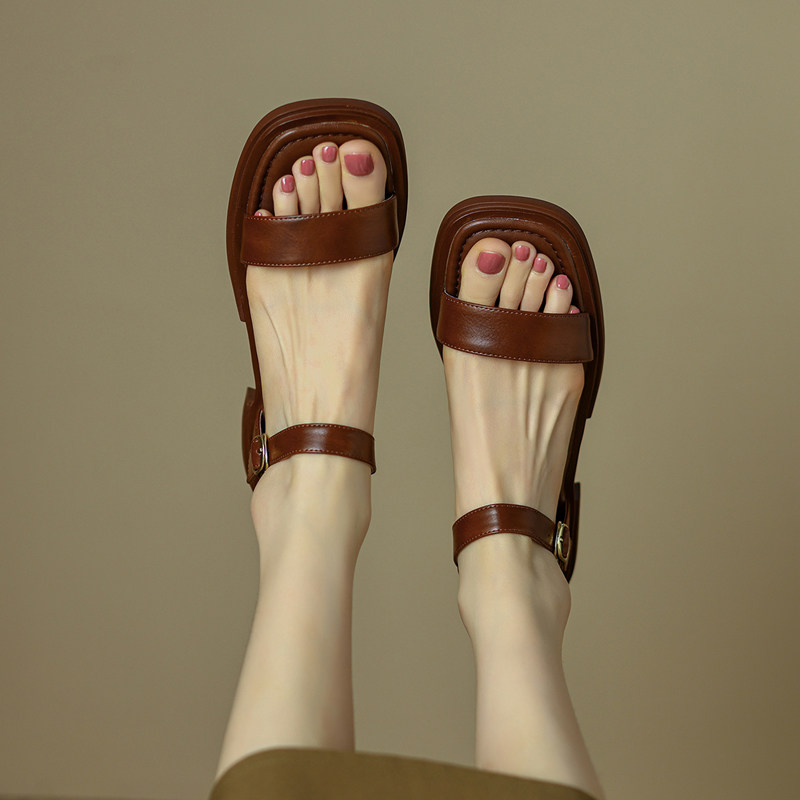 Hong Kong vintage simple one-line with leather Roman sandals women's summer flat soft sole beach open toe plus size 41 to 43