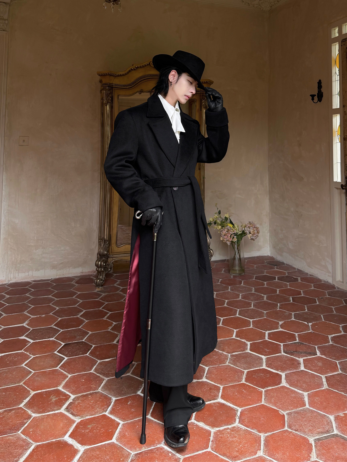 Balitone "Don Juan" Original Red Woolen Coat with Navy Collar, Waist-Cinching, Long Style, Shoulder Pads, Woolen Coat for Men