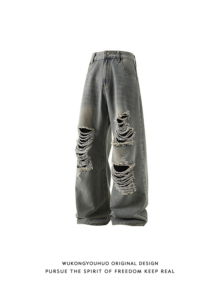 Wukong Has in Stock Trendy American High Street Ripped Distressed Washed Denim Jeans for Men, Loose Casual Trendy Wide-Leg Pants