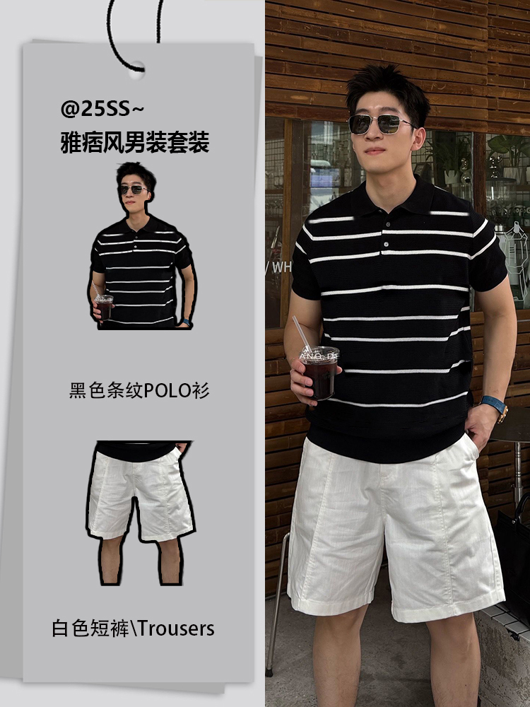 Yuppie Old Money Style Black and White Cotton Gauze Knitted Striped Short-Sleeved Polo Shirt for Men 2025 Summer Outfit Complete Set