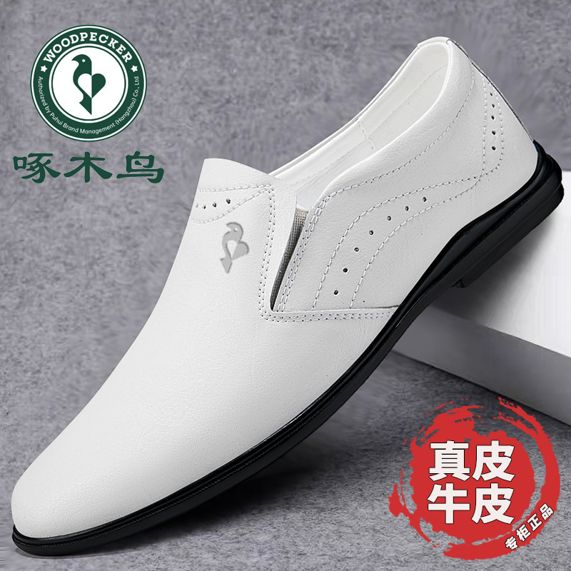 Woodpecker Leather Shoes for Men 2025 Spring New Genuine Leather Breathable Casual Soft Surface Soft Sole White Men's Slip-On Shoes