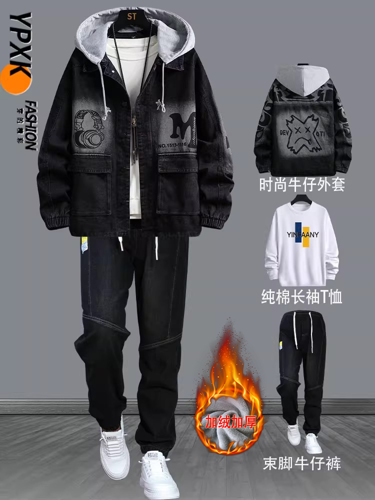 Teenage Denim Outerwear Set for Men, Spring and Autumn 2024 New Trendy Style, High School and Junior High School Students, Fleece-Lined and Thickened for Winter