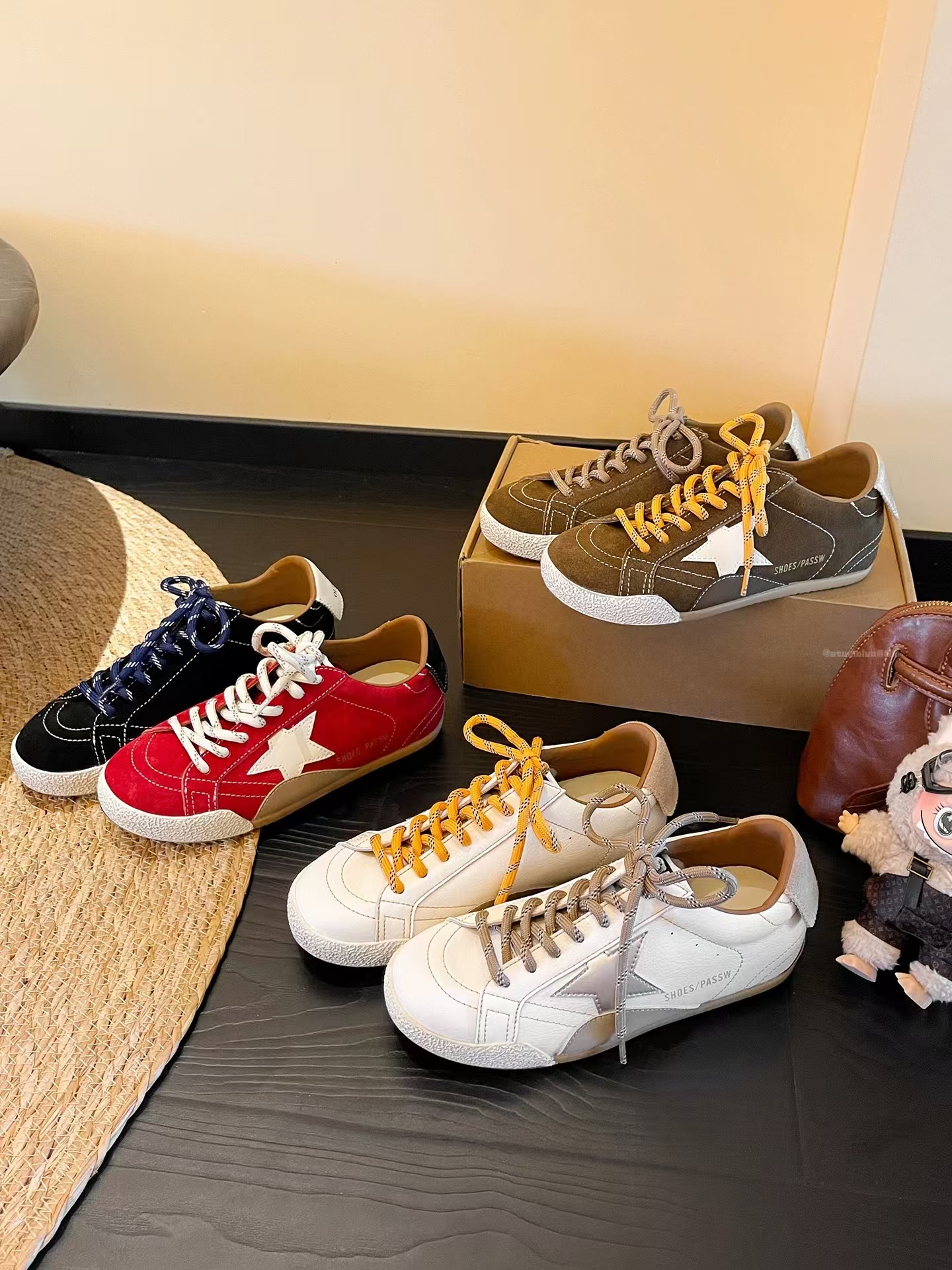 Hong Kong Thick-Soled Genuine Leather Star Shoes for Women 2025 New Versatile Lace-Up Casual Sports Sneakers White Shoes Dirty Shoes