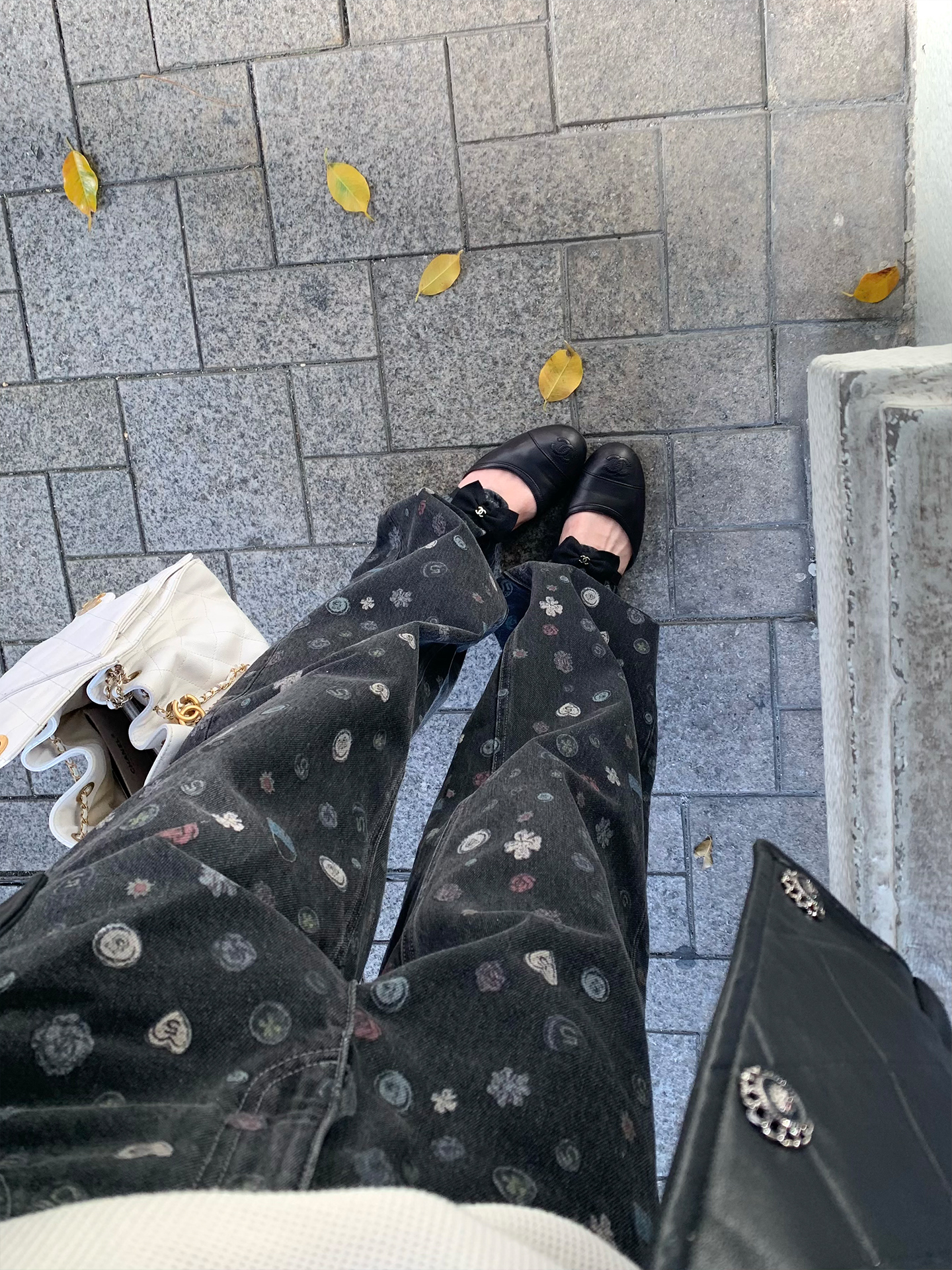 Good Morning, Fanfan! Detailed and Full of Texture! 25B Dark Pattern All-Over Printed Jeans, Straight-Leg Slimming Regular/Brushed Long Pants
