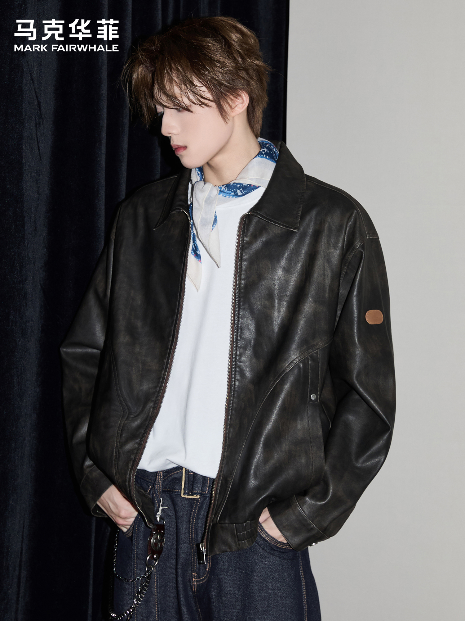 Mark Hua Fei Leather Jacket for Men, New Autumn Trendy Brand, High-End Retro Cool Silhouette, Lapel Biker Pu Leather Jacket