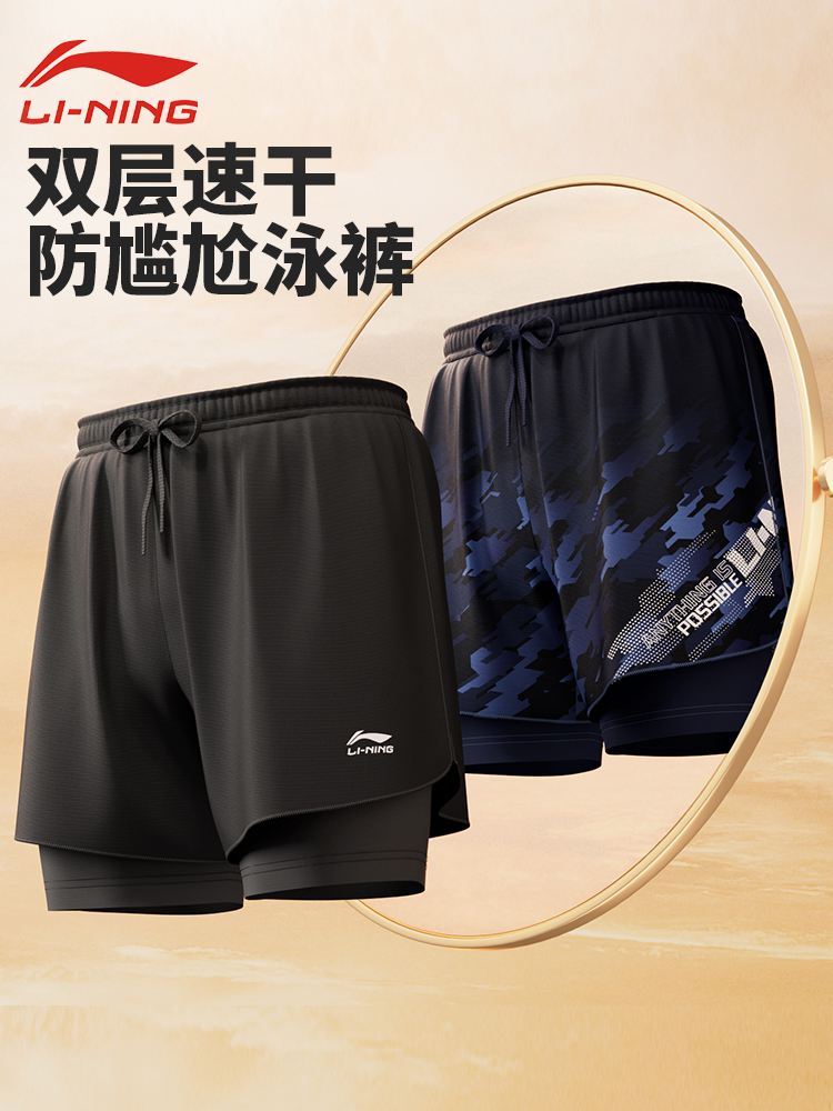 Li-Ning Men's Swimming Trunks 2025 New Anti-Embarrassment Hot Spring Beach Shorts Adult Swimwear Swim Cap Swimming Goggles Three-Piece Set