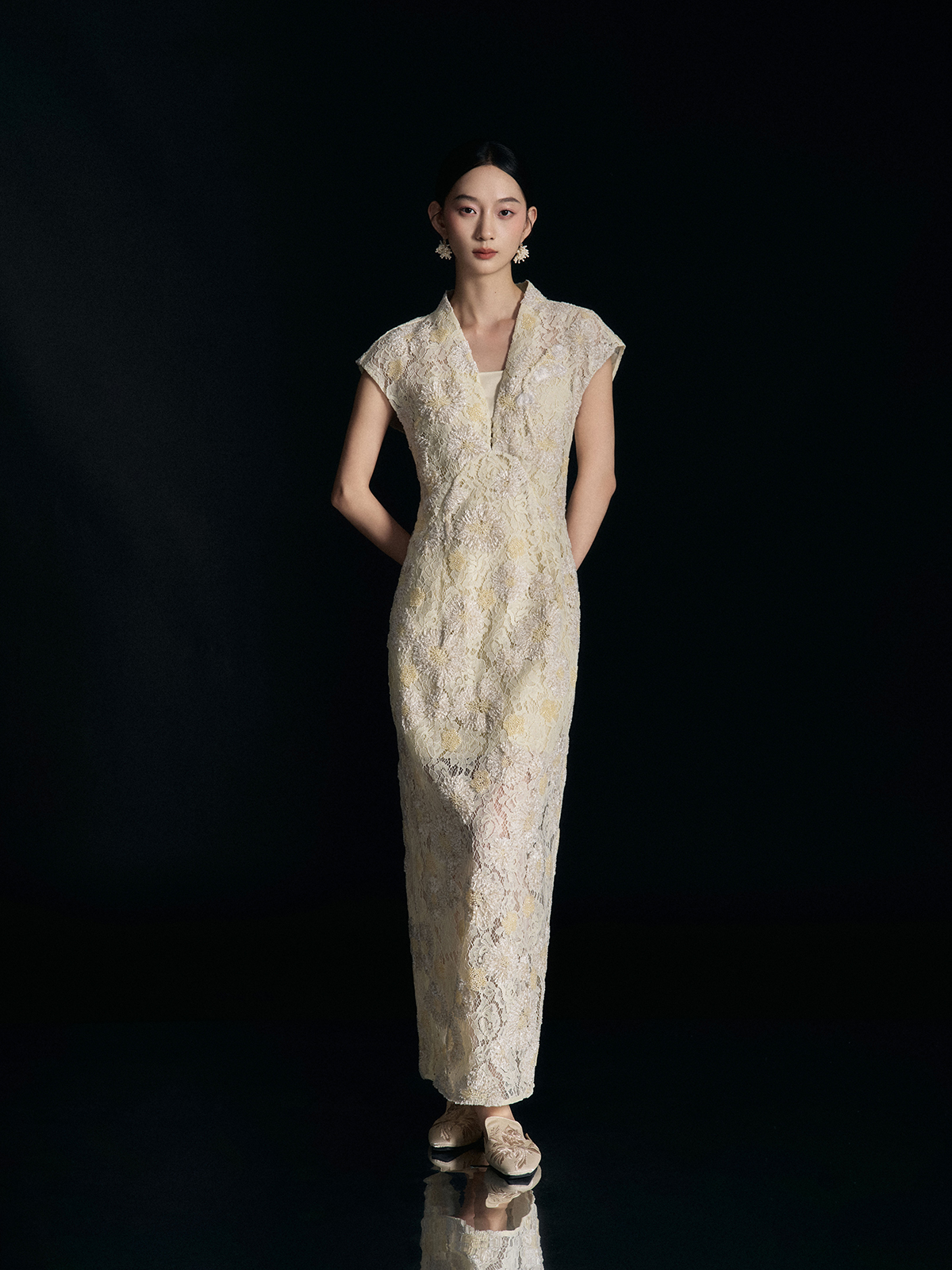 Nian Shier [Lan Xiu] Lace Sequin Embroidery V-Neck Sleeveless Dress New Chinese Style White Agate Button Long Dress