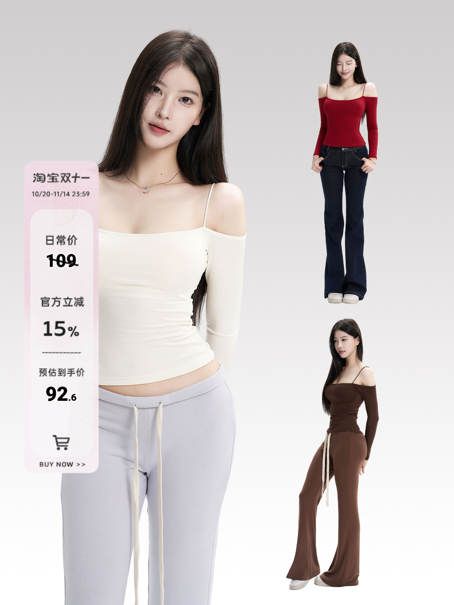 【Fart Shop】Pure and Desirable Design Slim Fit Off-Shoulder Strap Top with Chest Pads Long Sleeve Base T-Shirt for Women