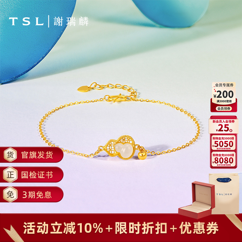 Tsl Xie Ruilin Gold Bracelet Inlaid with Hetian Jade Gourd, Pure Gold Bracelet with Symbolic Meaning for Women X5130
