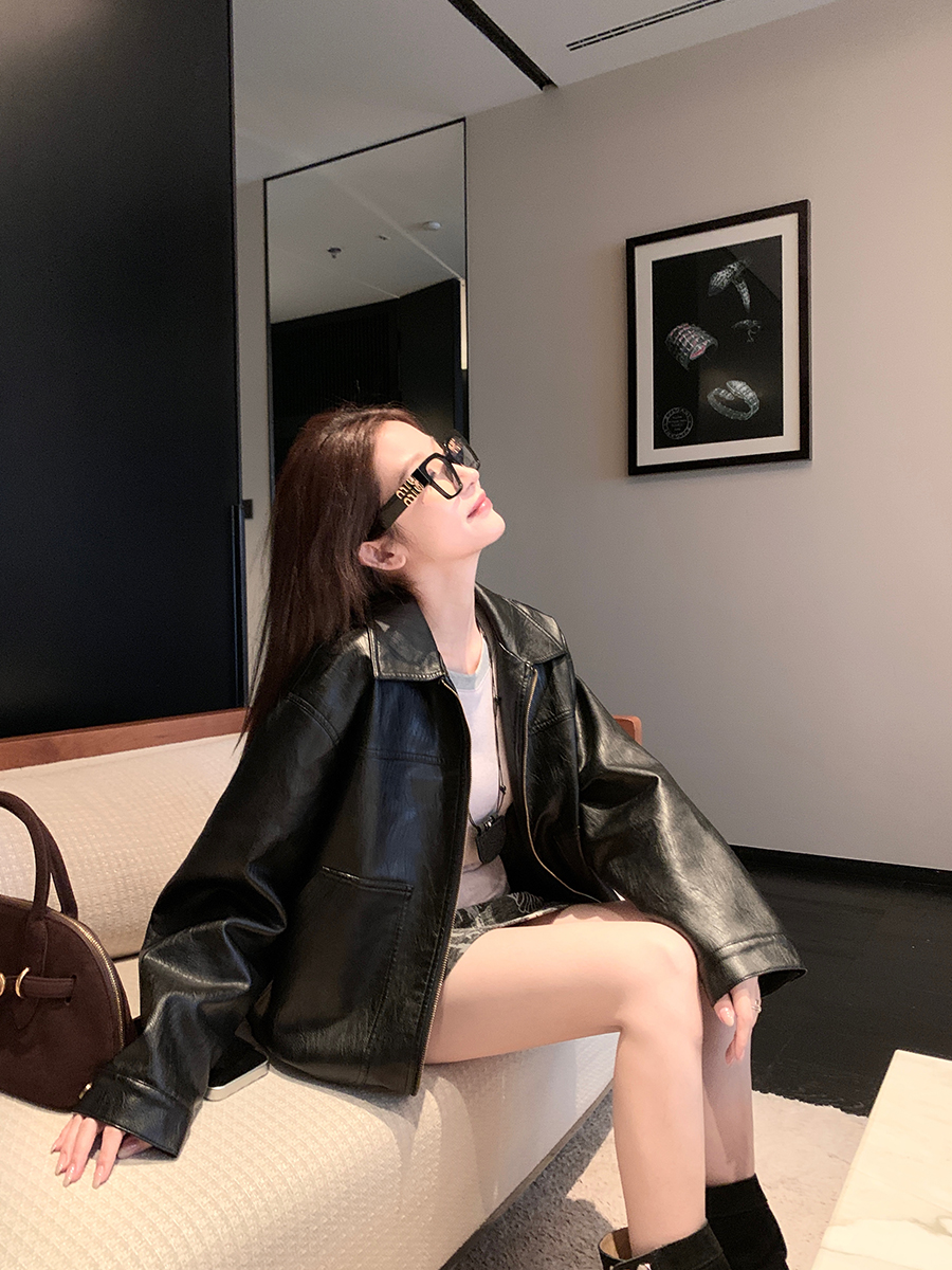 Yang Yang Yangruoyu【Vintage Weekly】Black Lapel Leather Jacket for Women, Stylish Hong Kong Style Loose Jacket for Women