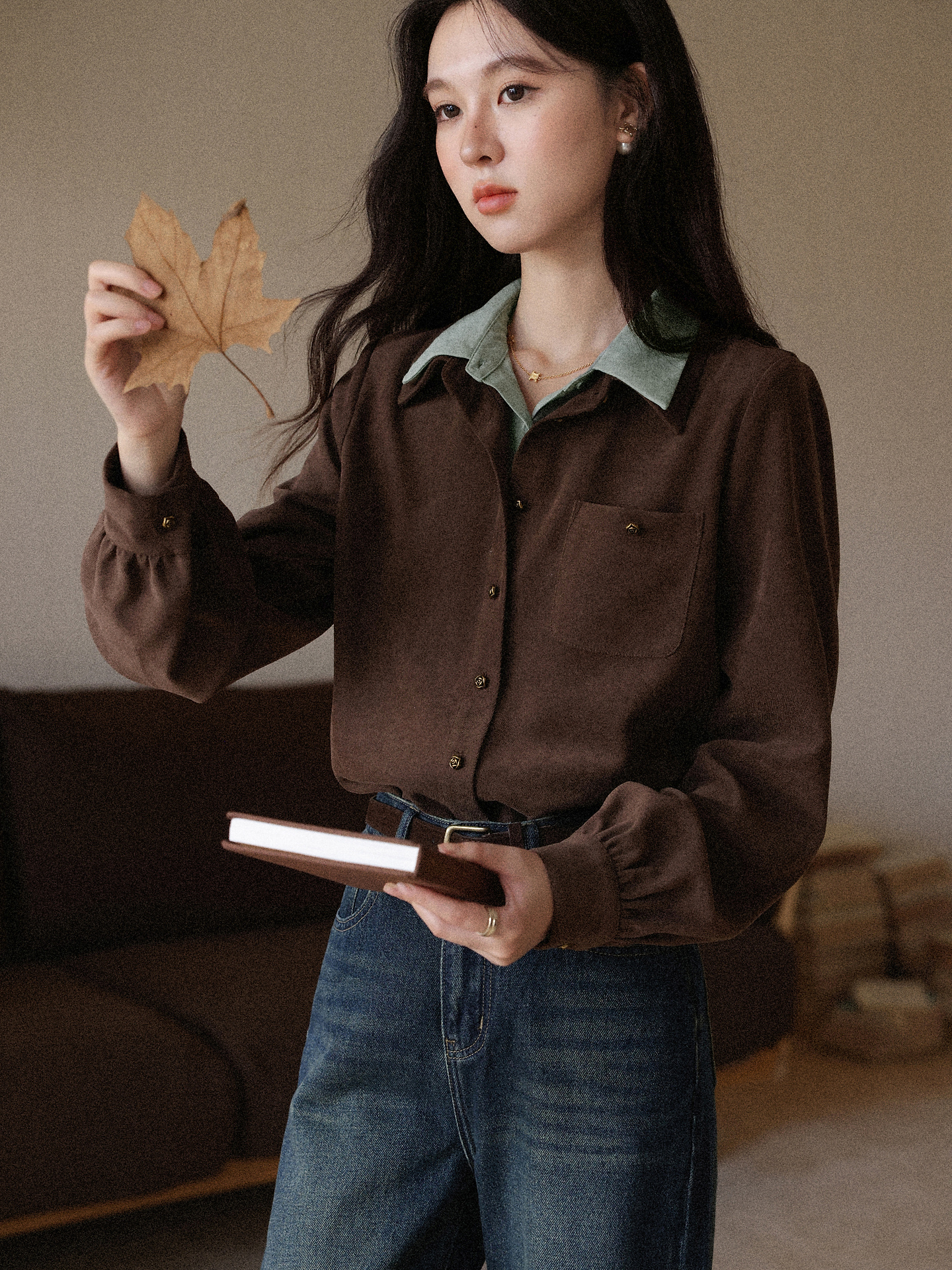 Lu Xiangnan's "Pine Tea Cocoa” Two-In-One Shirt in a Melange Coffee Color for Women, Early Autumn Elegant Top, French-Style Shirt