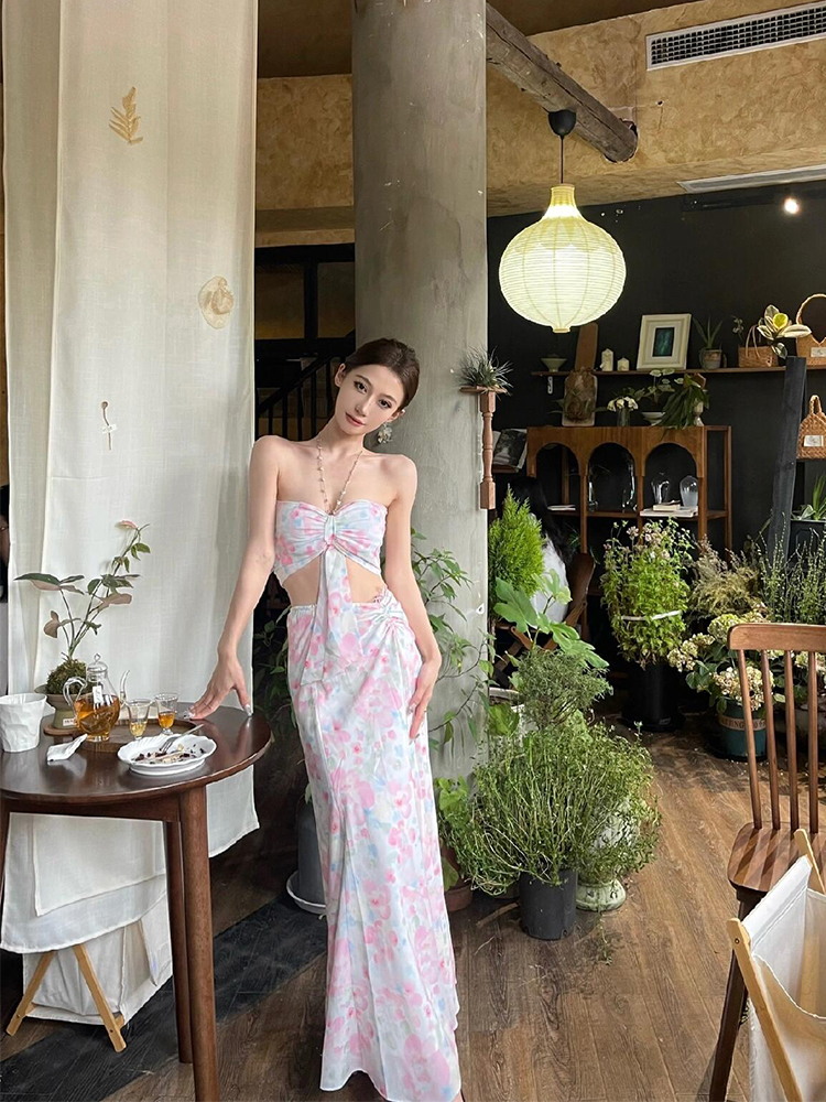 Travel Photography Vacation Outfit Set Long Dress Elegant Pink Floral Strapless Halter Neck Fishtail Dress Two-Piece Set