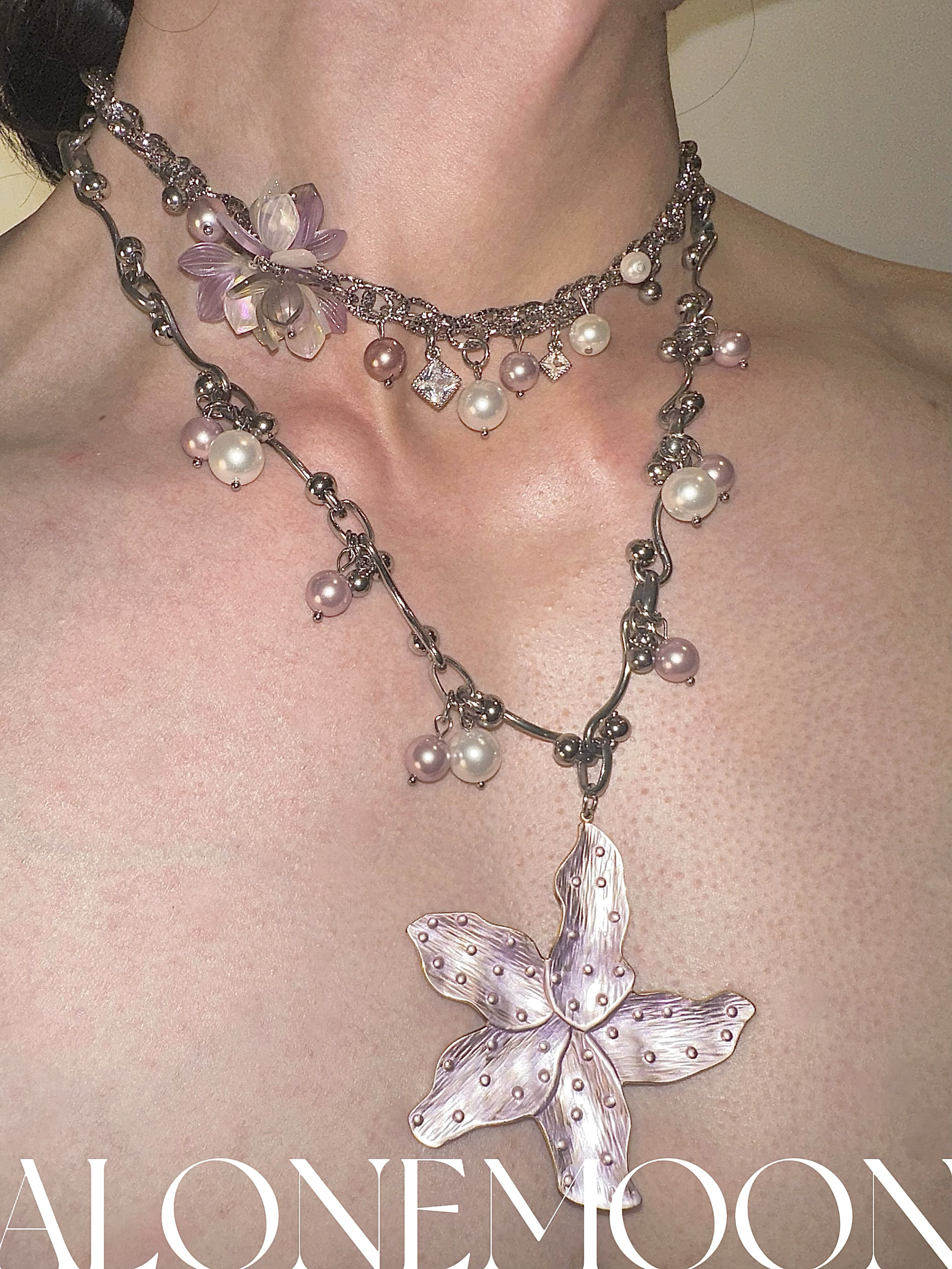 Alonemoon Original Design Star Flower Titanium Steel Pink Purple Pearl Necklace