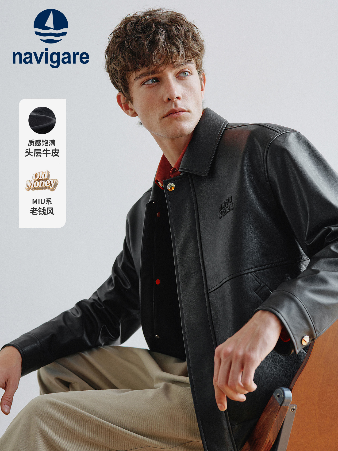 Navigare Italian Small Sailboat Retro Lapel Genuine Leather Jacket Men's Spring and Autum New Black Leather Jacket
