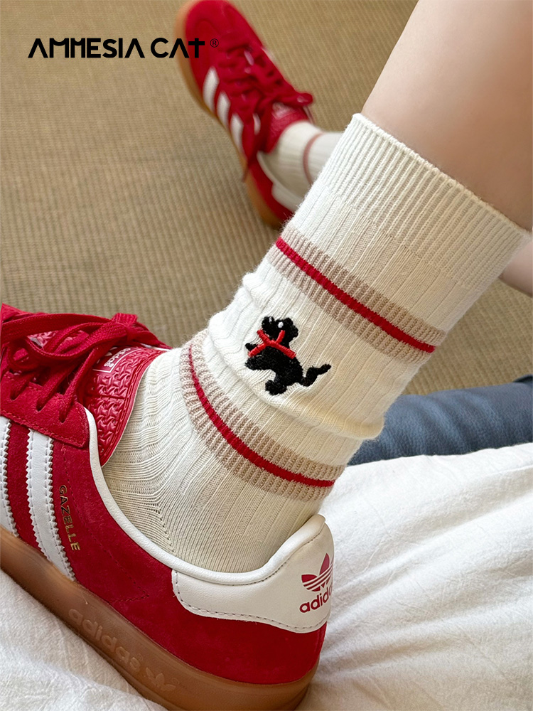 White Socks for Women, Autumn and Winter ins Trendy Mid-Calf Socks, Cute Korean Style Striped Puppy Long Socks, Autumn Cotton Socks