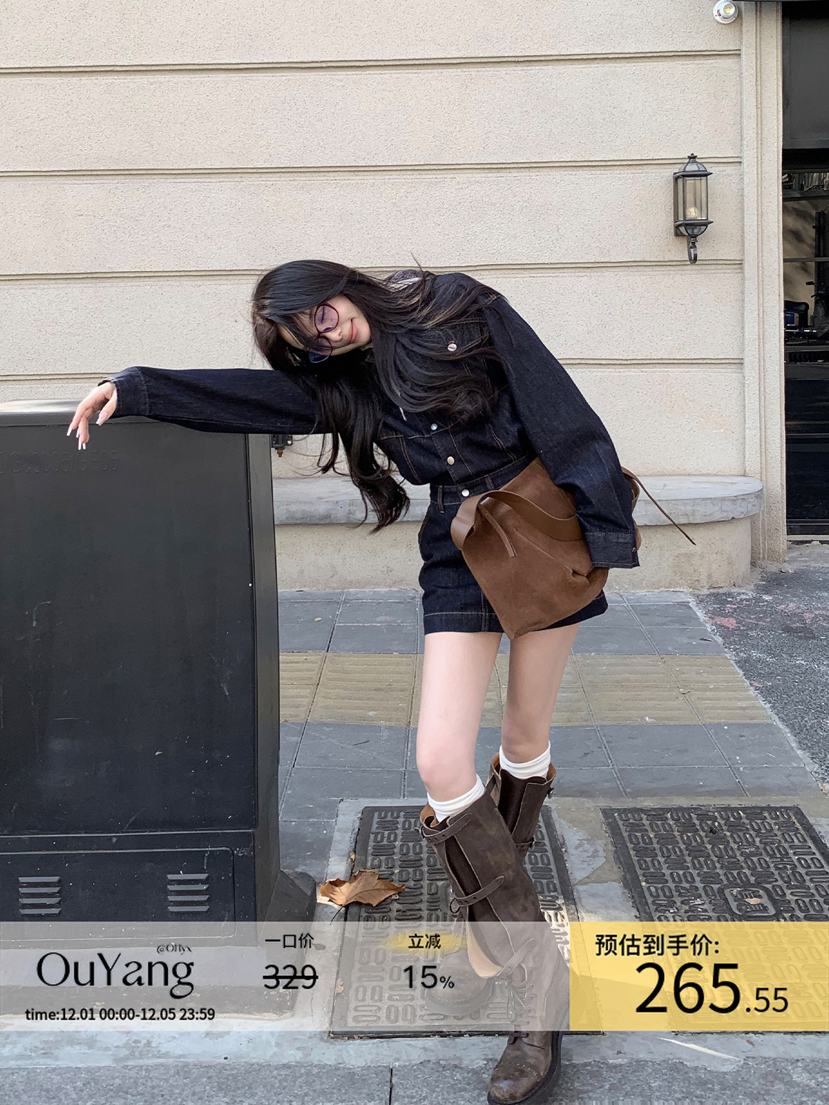 Ouyang Brand Washed Denim Shirt Dress for Women, Autumn Vintage Short Skirt, Waist-Cinching and Slimming Dress for Petite Figures