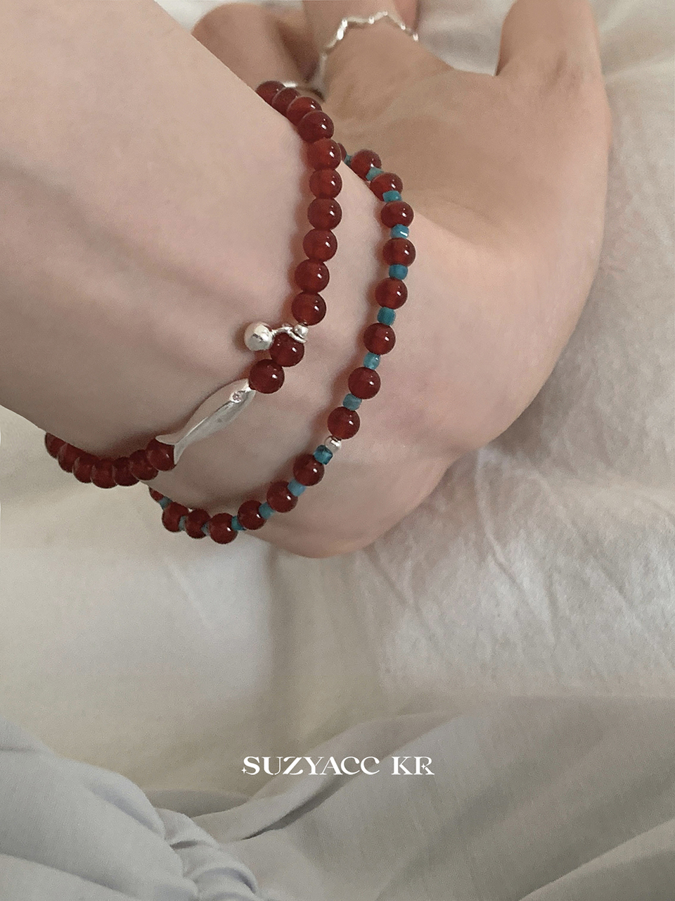 Suzyacc Kr Color-Blocked Red Agate Beaded Sterling Silver Bracelet, Chinese Style, Vintage, Light Luxury, Niche, Gift for Best Friend, Women's Jewelry