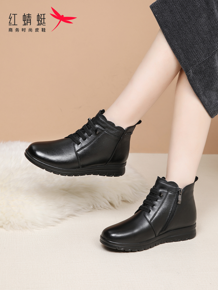 Red Dragonfly Winter Women's Flat Boots, Short Boots, Mid-Calf Genuine Leather, Fleece-Lined, Warm Wool, Mom's Cotton Shoes, Mid-Top