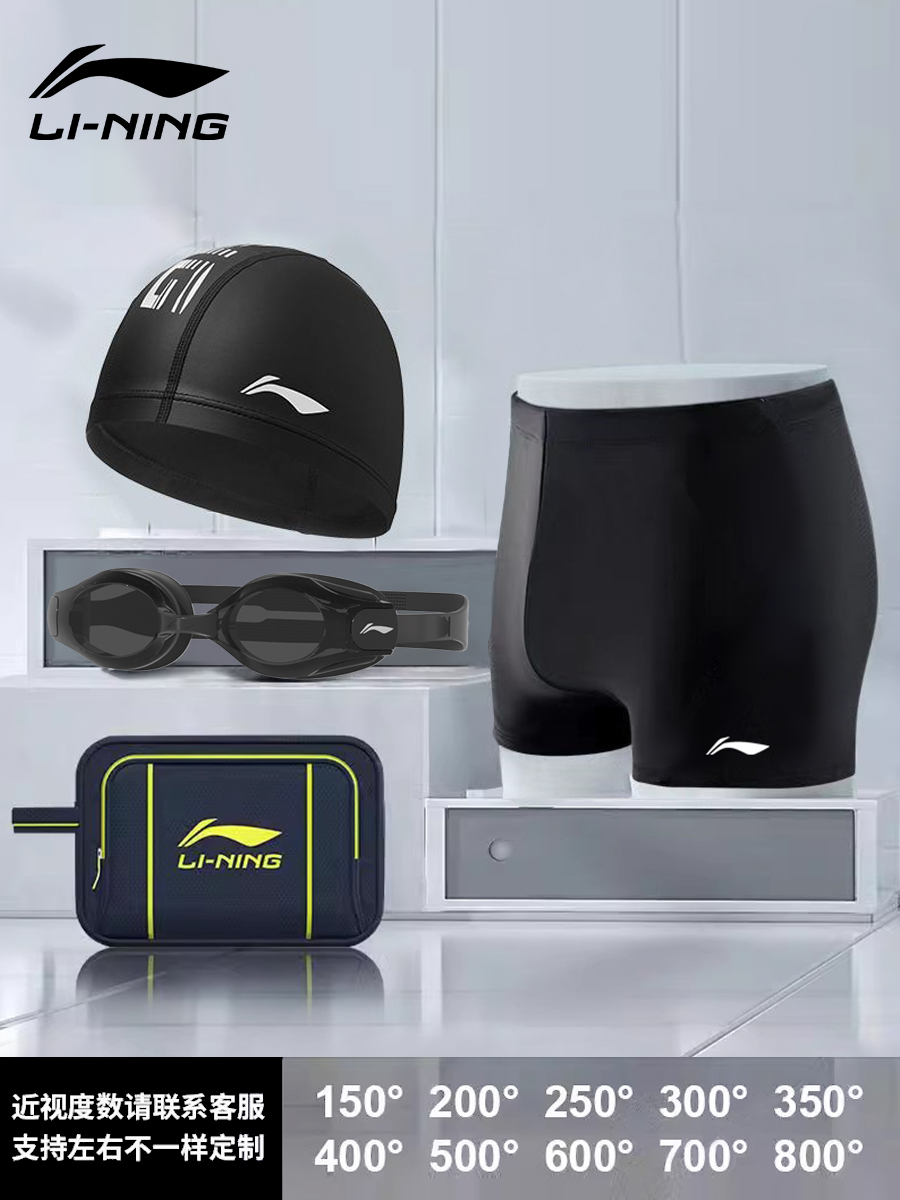 Li-Ning Swimming Trunks, Swimming Cap, and Swimming Goggles Set, Professional Swimming Gear Three-Piece Set for Men, Anti-Embarrassment Square-Leg Design for Hot Springs