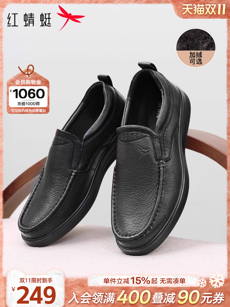 Red Dragonfly Dad Men's Leather Shoes Winter Slip-On Genuine Leather Men's Shoes Comfortable Middle-Aged and Elderly Men's Large Size Shoes