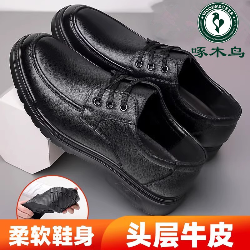 Woodpecker Men's Shoes, Autumn Fleece-Lined Leather Shoes, Men's Genuine Leather Soft-Soled Business Casual Shoes, Lightweight Non-Slip Dad Shoes