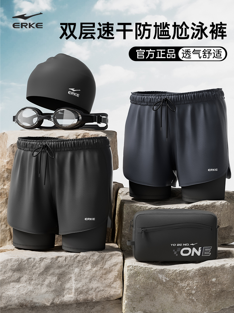 Hongxing Erke Swimming Trunks Anti-Embarrassment Loose-Fitting Boxer-Style Hot Spring Swimwear Men's Five-Point Double-Layer Swimming Gear Set