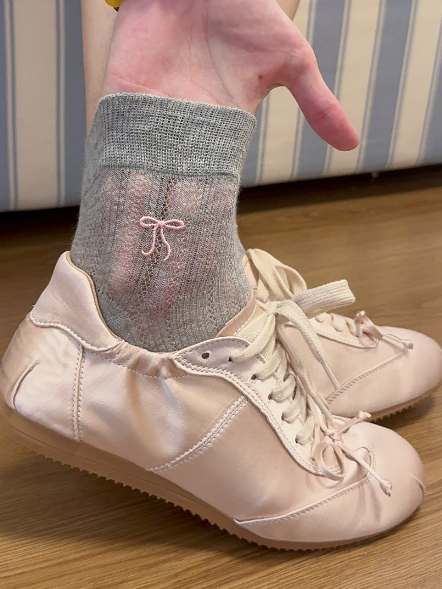 Gray Ballet-Style Socks for Women, Summer Thin Combed Cotton Bow Short Socks, Hollow Mid-Calf Socks