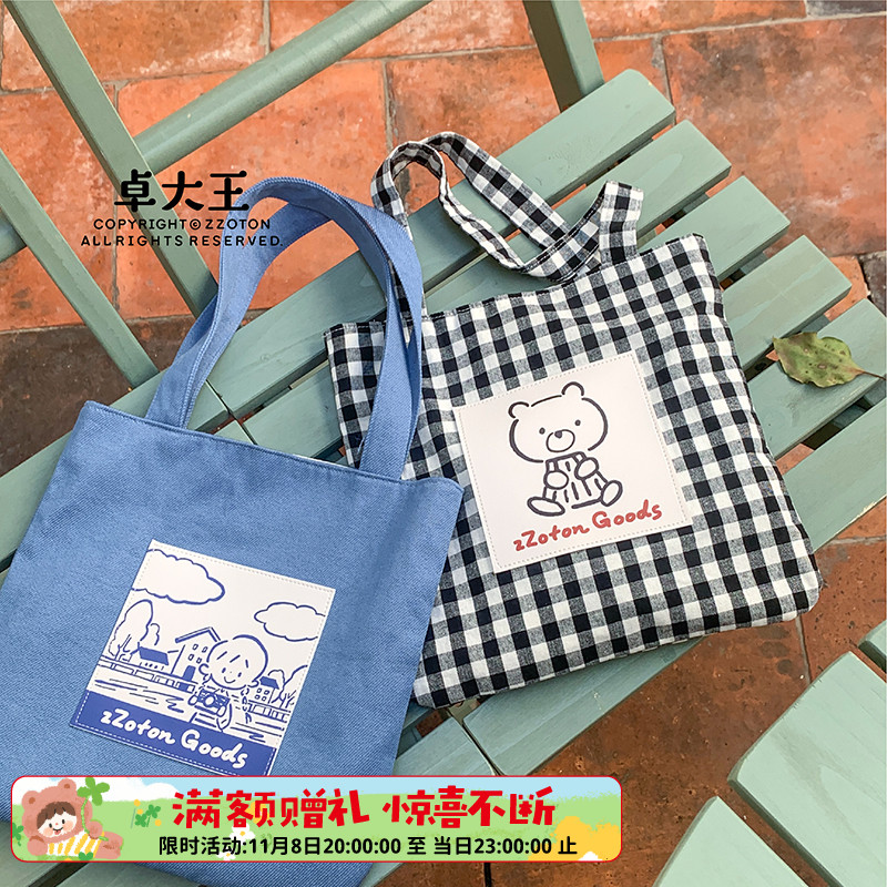 Zhuo Dawang [Azhuo Small Tote Bag] Illustration Plaid Denim Original Artistic Daily Outing Bag Inner Liner Handbag