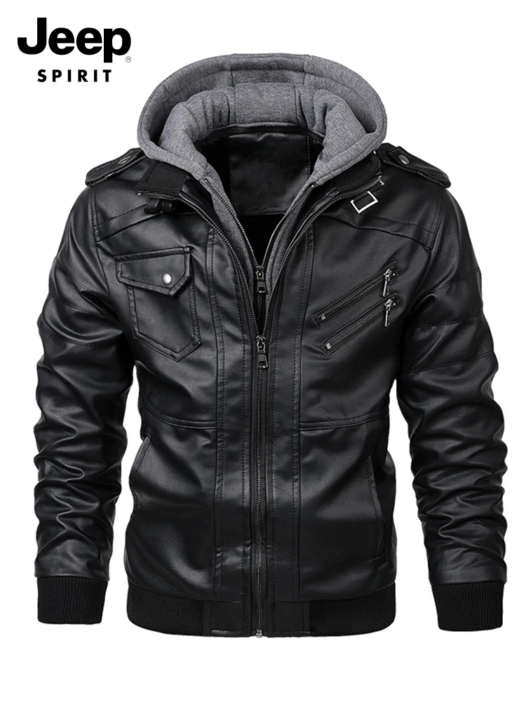 Jeep Men's Leather Jacket Autumn and Winter New Fashion Trendy Windproof Motorcycle Leather Jacket Men's Hooded Leather Jacket