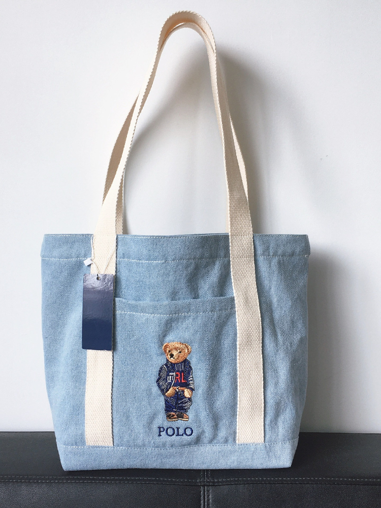 Lotte Japan-Korea Polo Webbing Denim Set Bear Embroidery Canvas Bag Shopping Bag Shoulder Tote Bag
