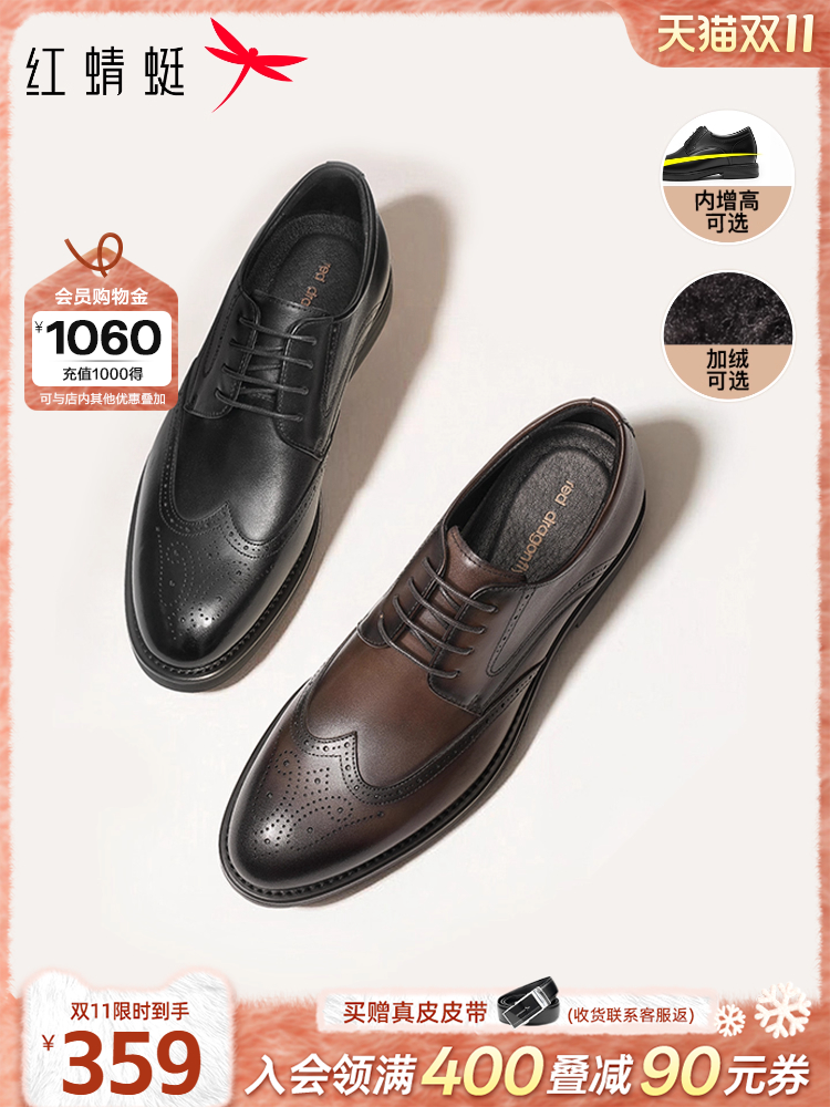 Red Dragonfly Men's Leather Shoes Wedding Brogue Genuine Leather Business Formal Men's Shoes British Style Large Size Height-Increasing Wedding Shoes