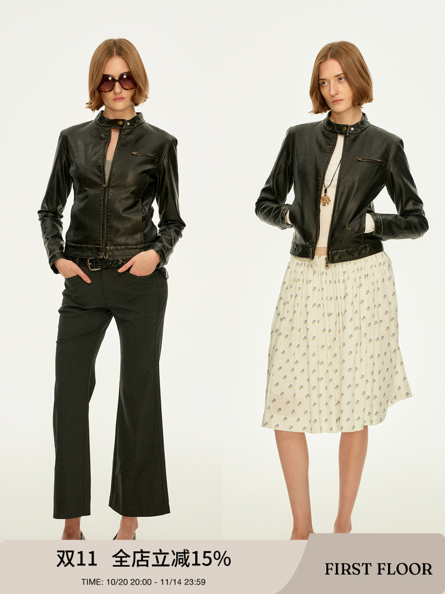 Firstfloor Modern and Straightforward Style Retro Slim-Fit Short Washed Leather Biker Jacket Short Coat