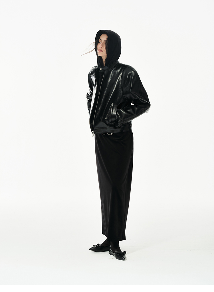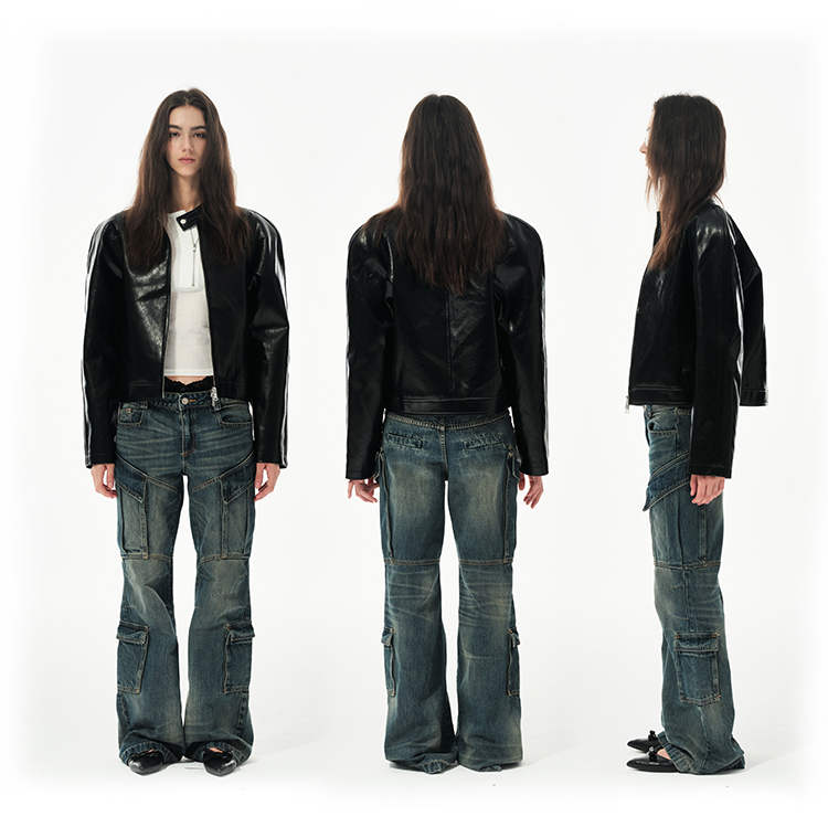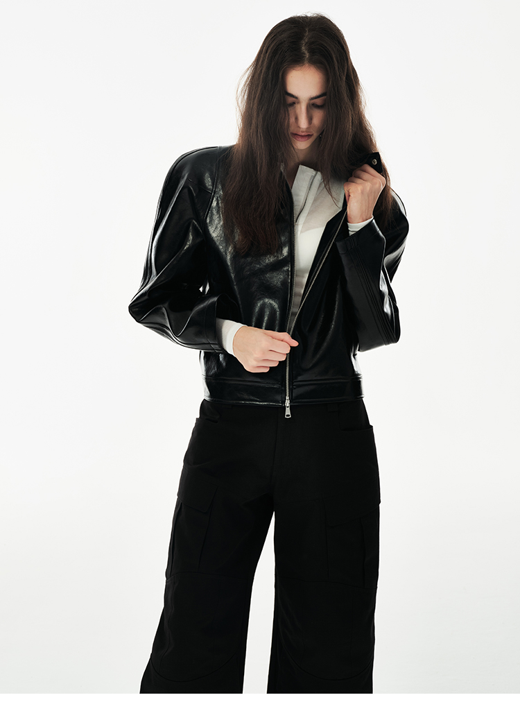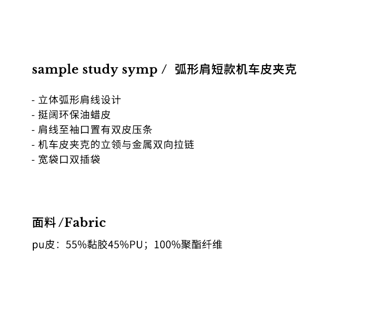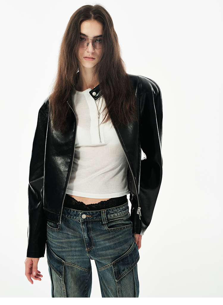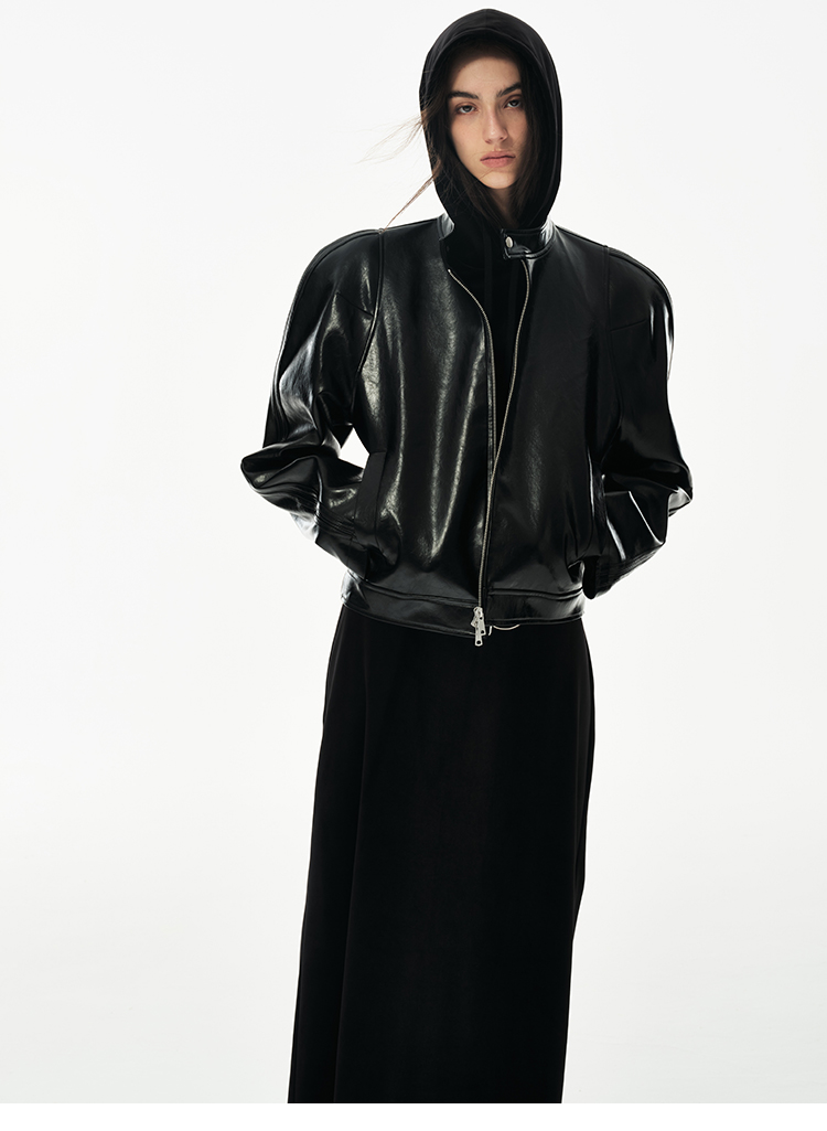Saumple Study Symp Curved Shoulder Short Biker Leather Jacket Women's Black Stand Collar Leather Jacket