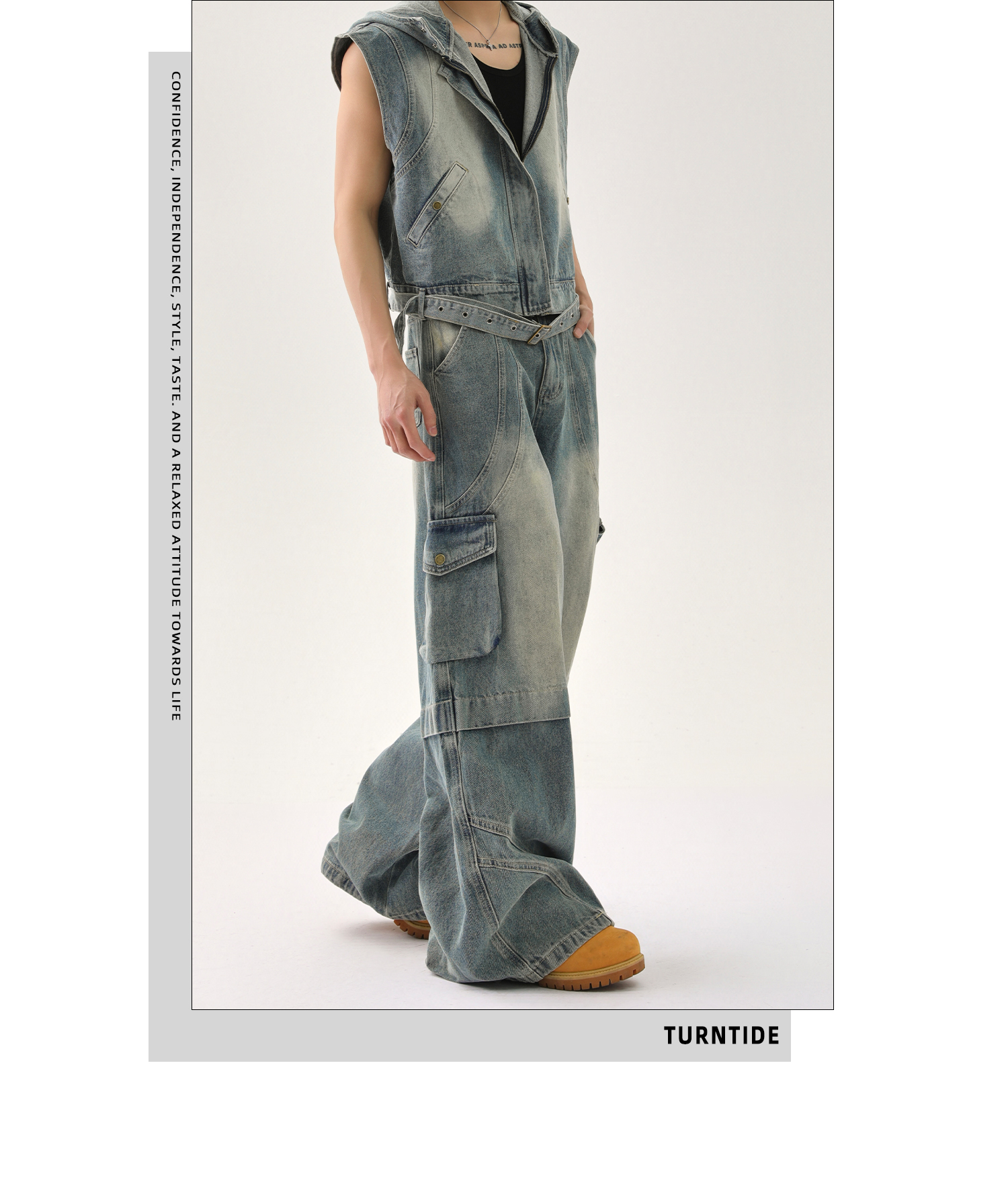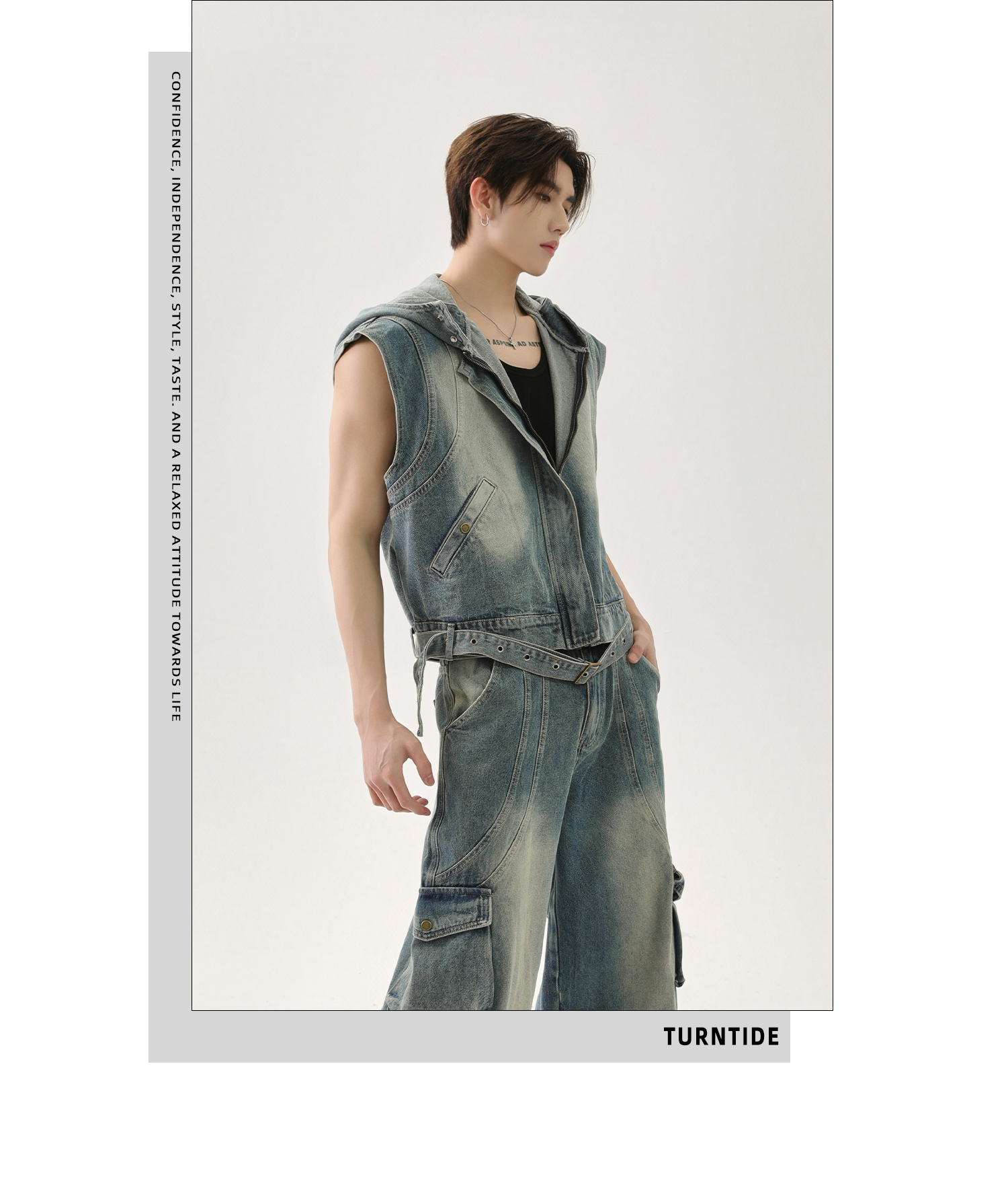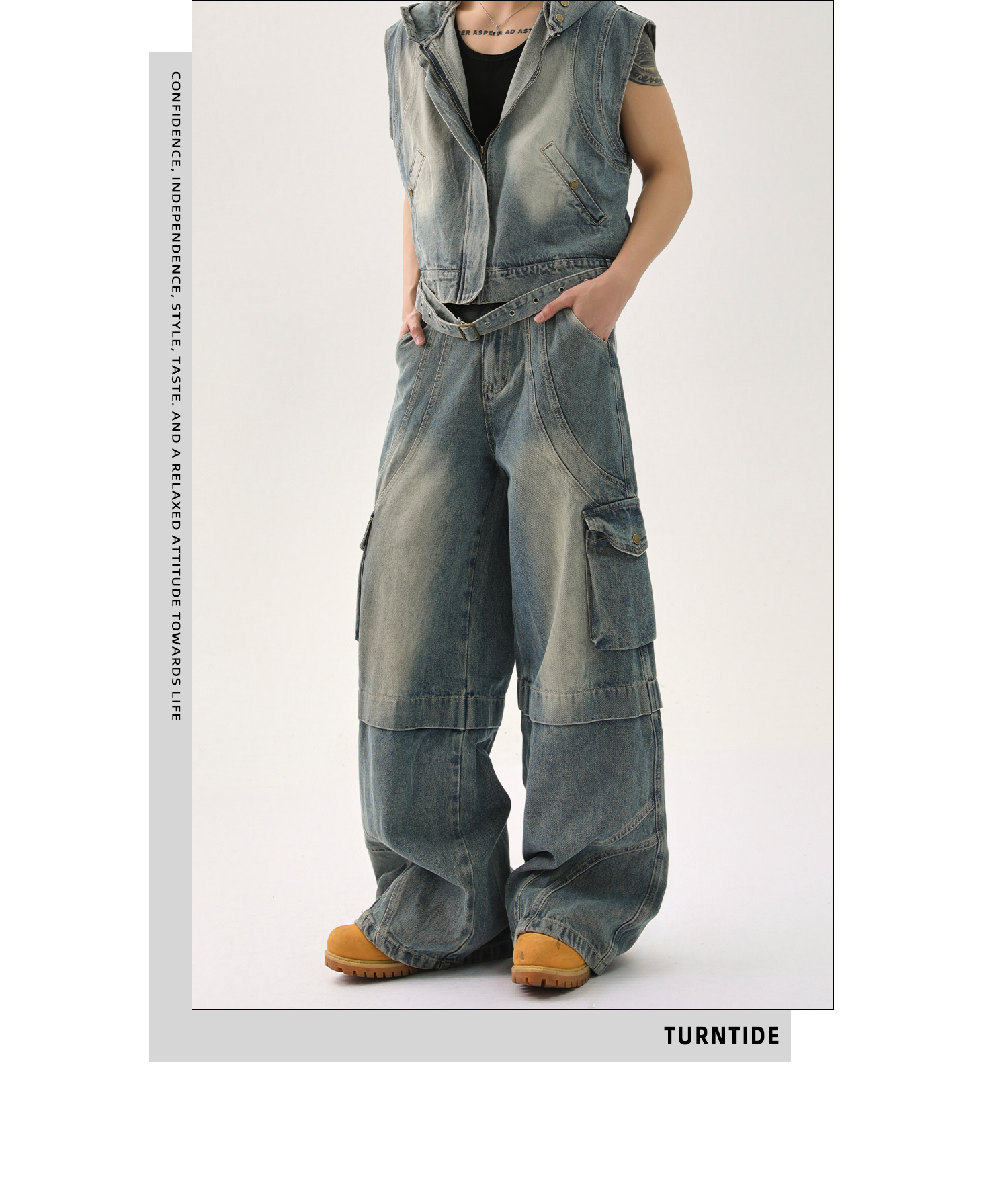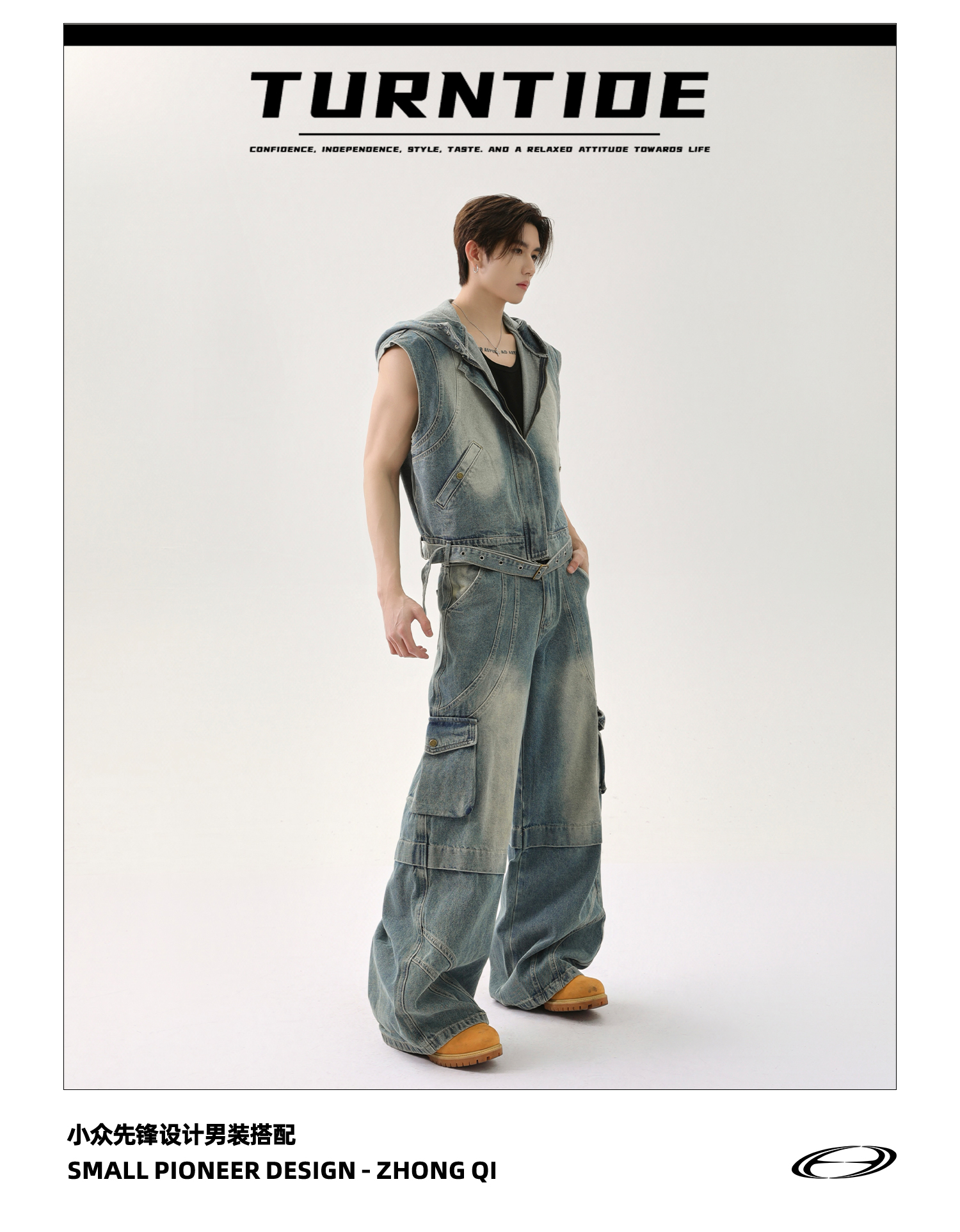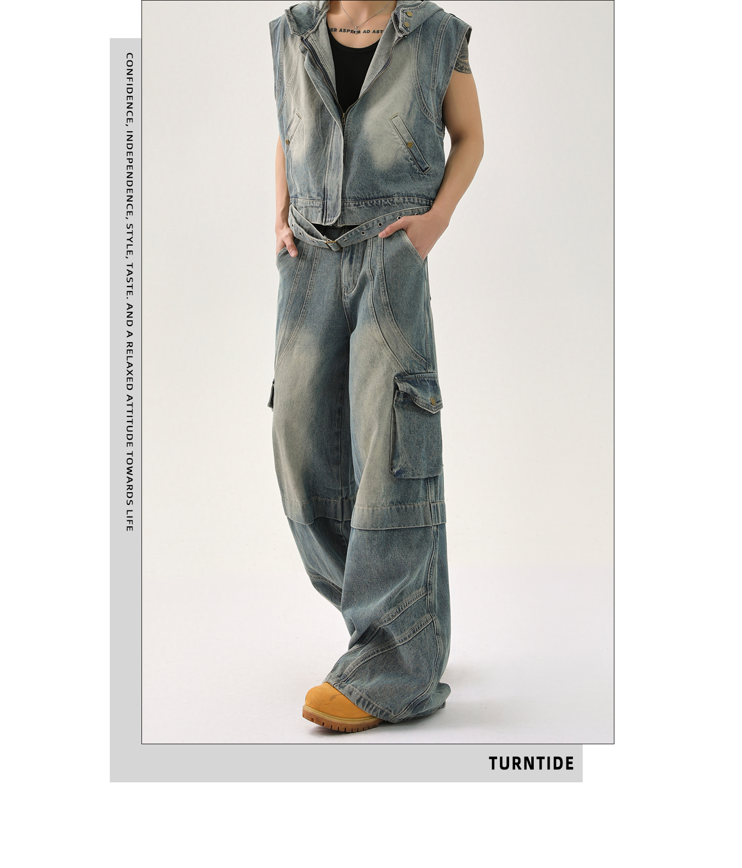 Turntide American Retro Distressed Denim Sleeveless Vest Jacket Versatile Patchwork Long Pants Casual Suit