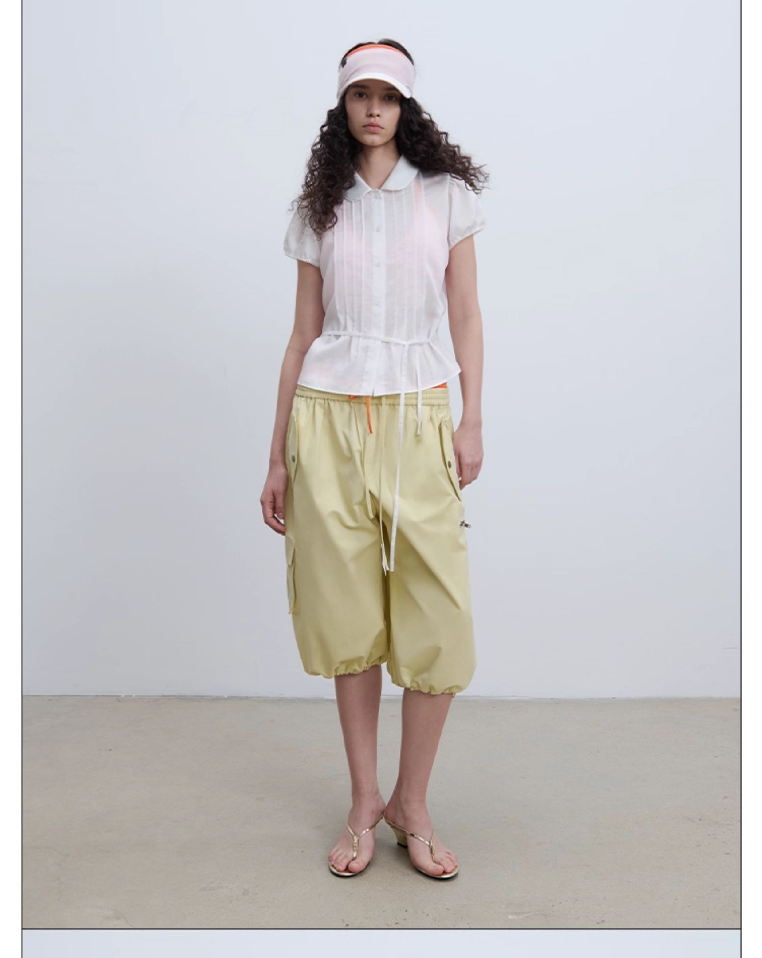 Rarely Alike Peter Collar Lace-Up Short-Sleeved Shirt White/Light Yellow