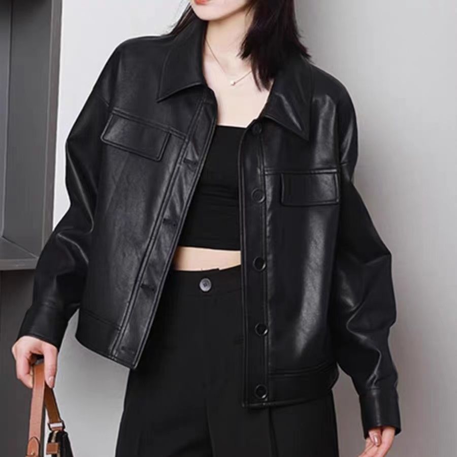 2025 Spring and Autumn New Style Coffee-Colored Lapel Pu Leather Jacket for Women, Loose Fit, High-End Motorcycle Style Leather Coat, Trendy
