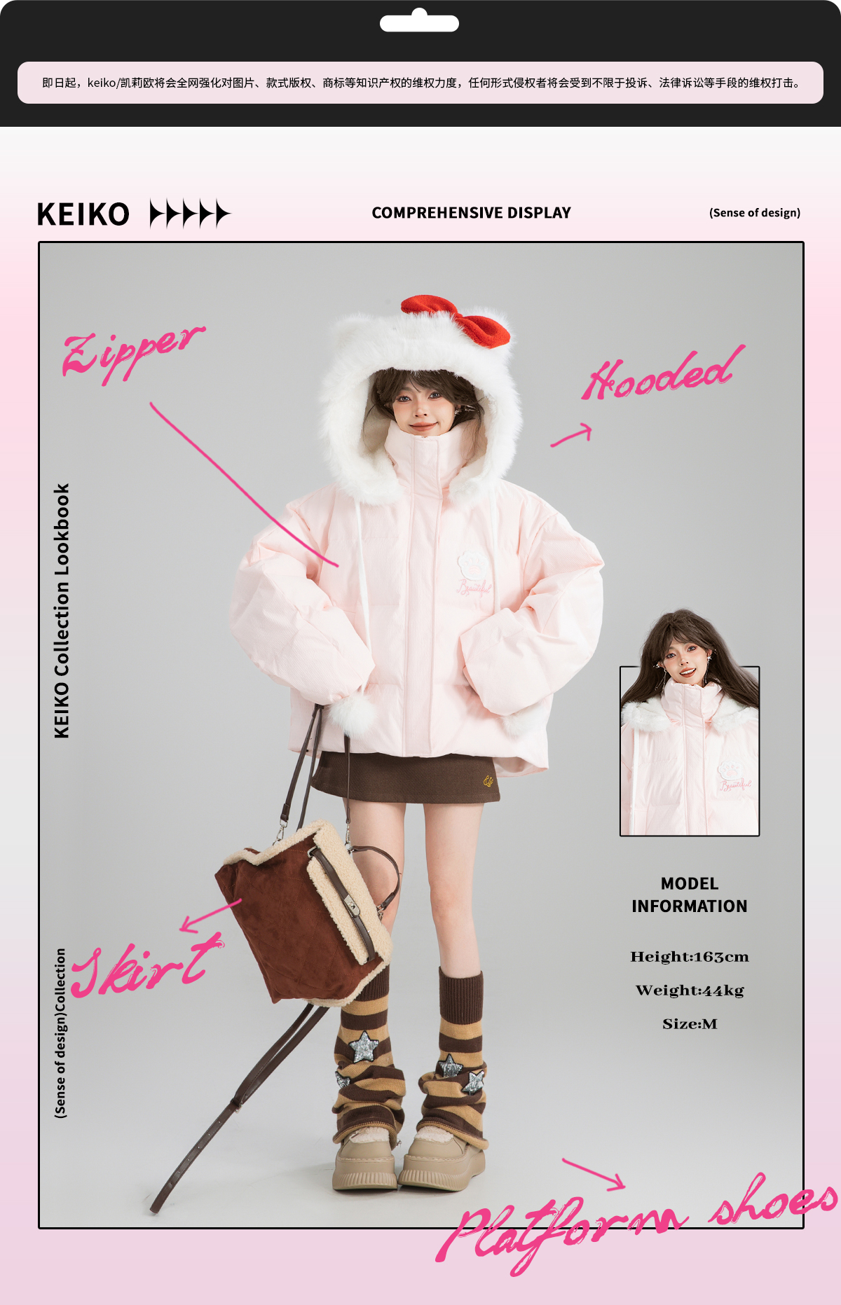 Keiko Cute Cat Plush Hooded Short Cotton Jacket Women's Winter Sweet Pink Loose Thickened Puffer Jacket