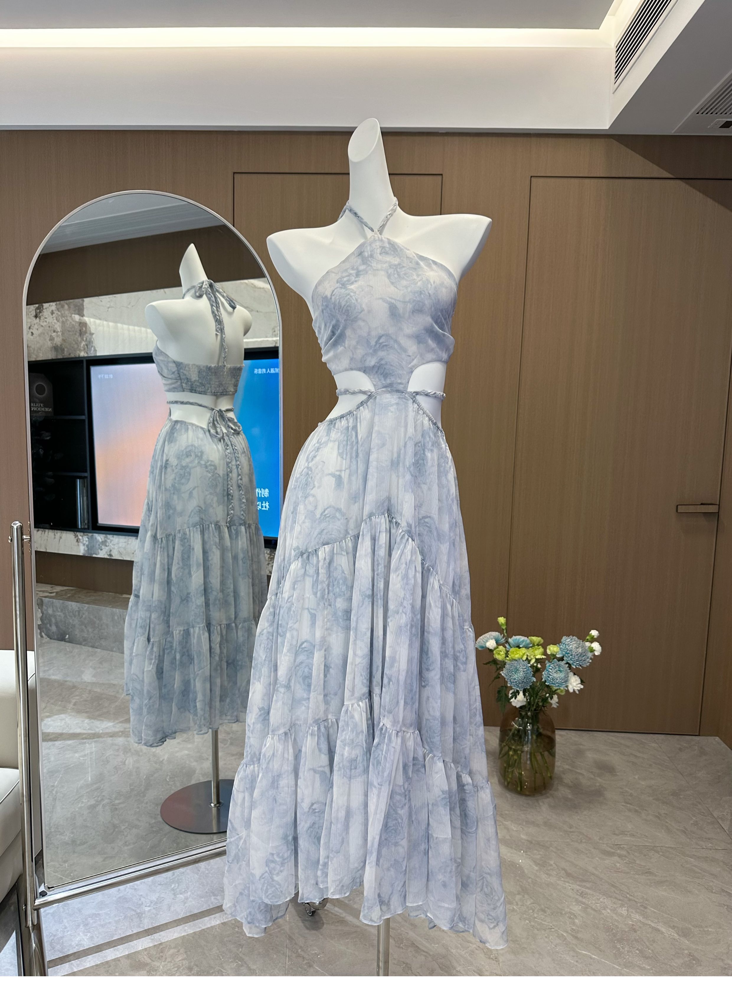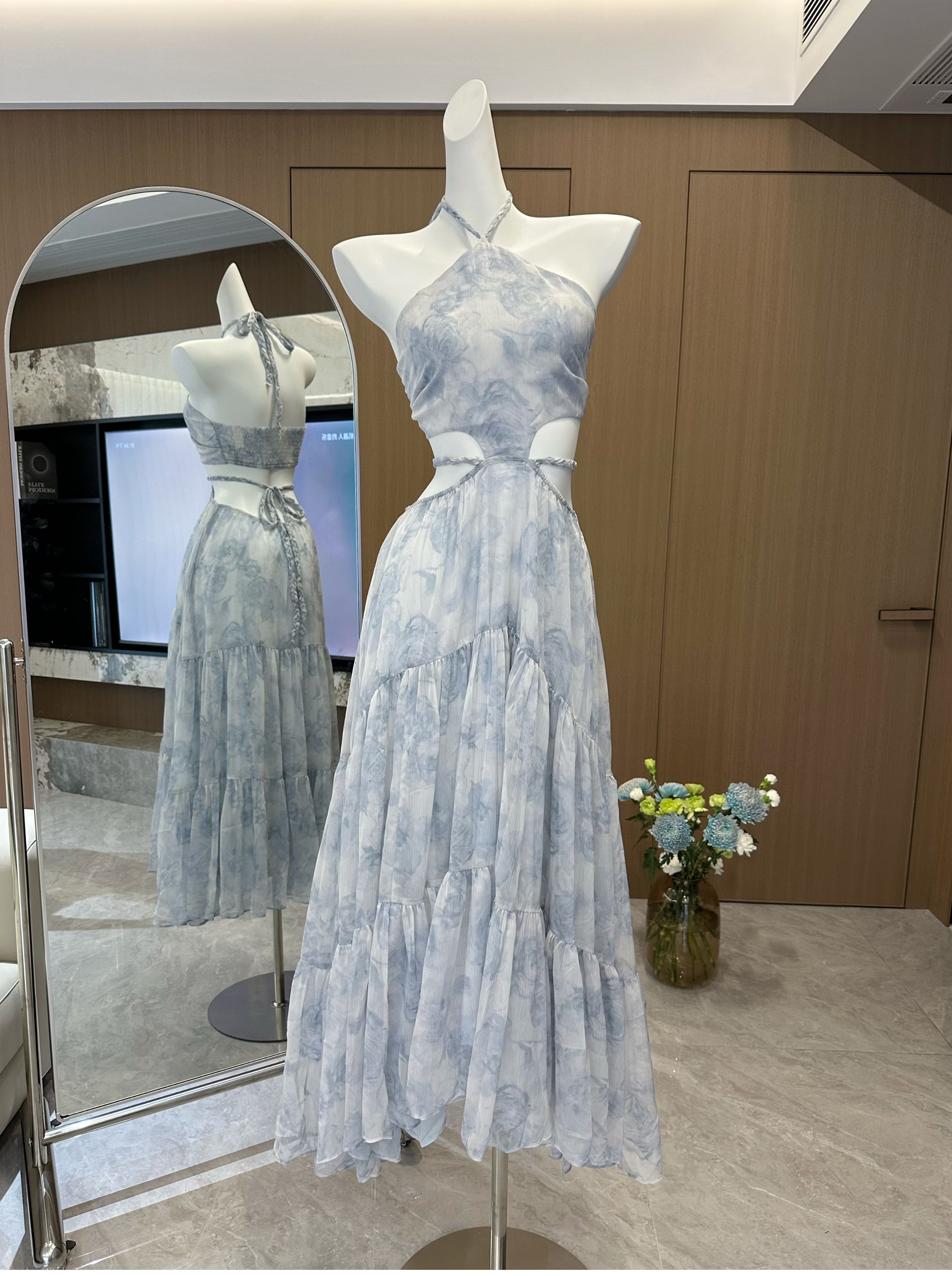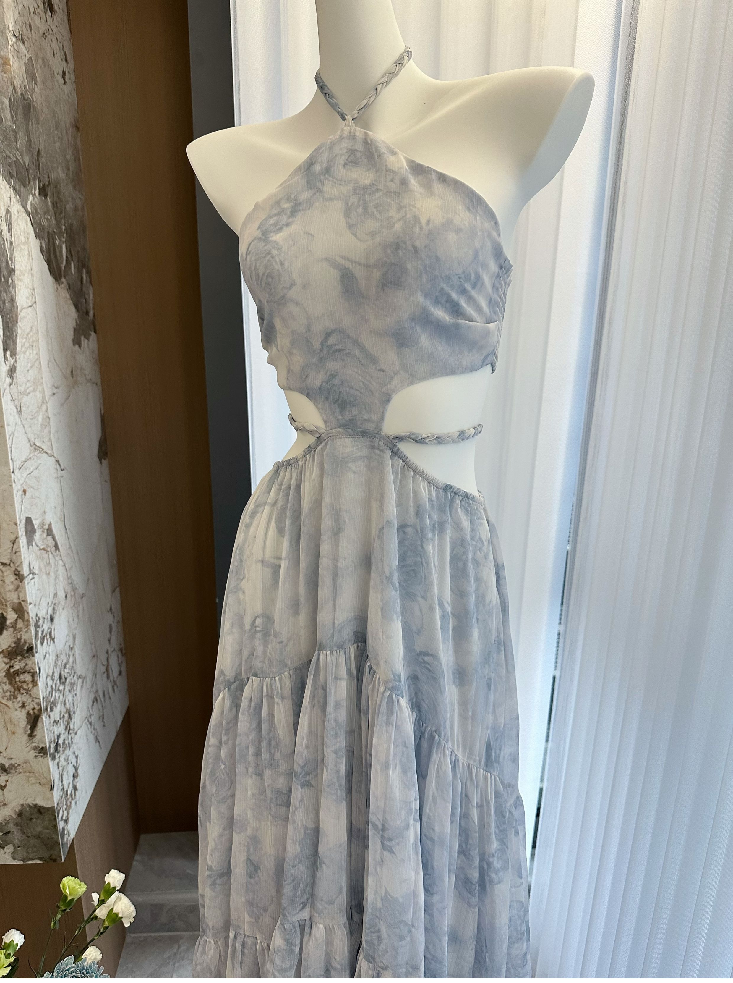 Youni Blue Rose Print Handmade Twist Braided Rope Waist-Revealing Sexy Elegant Petite Long Dress for Women in Summer