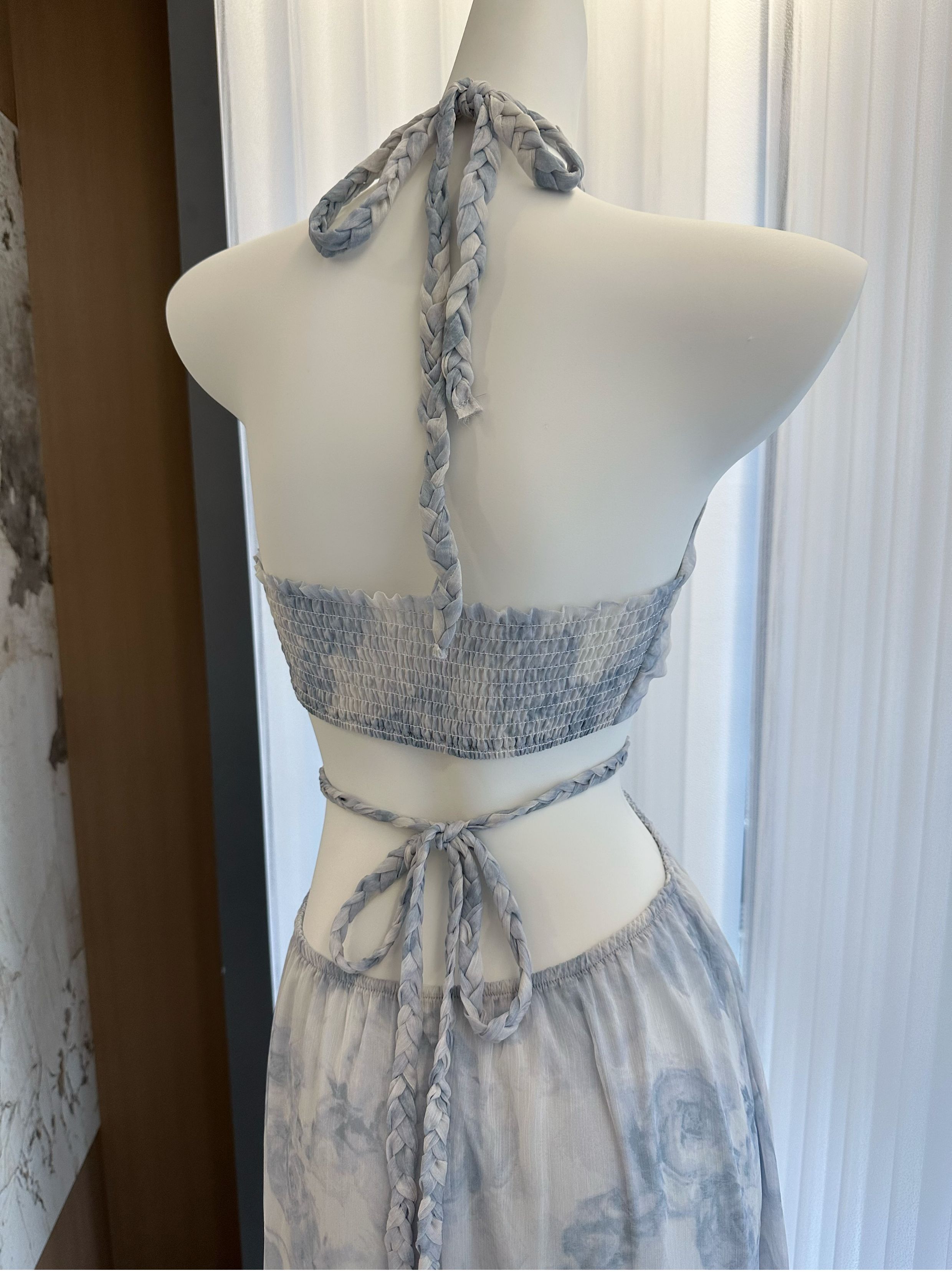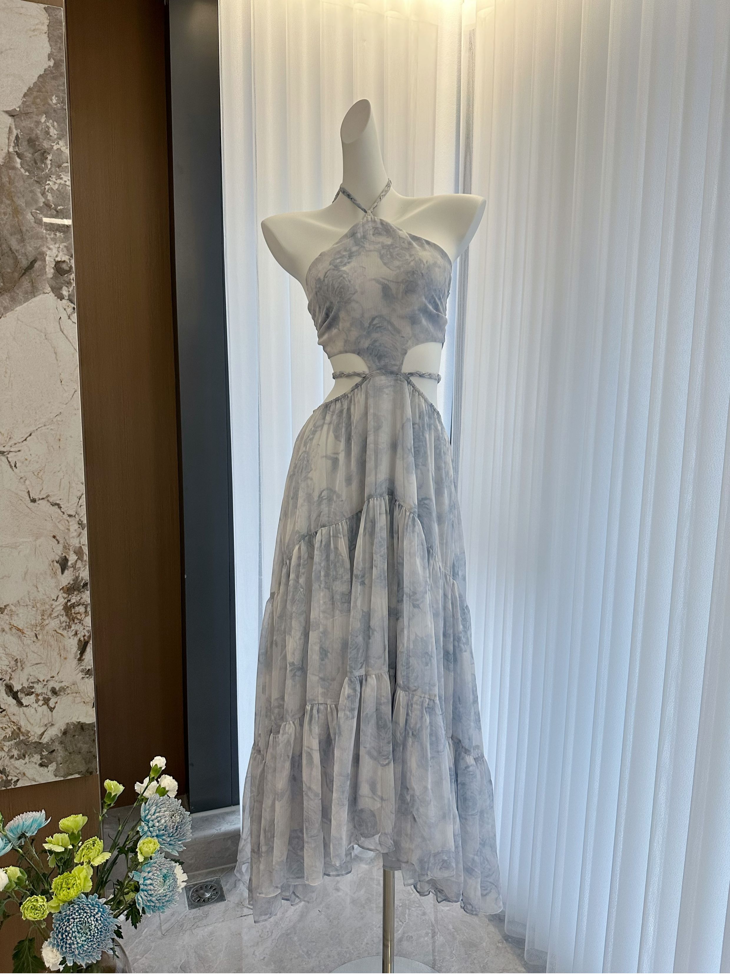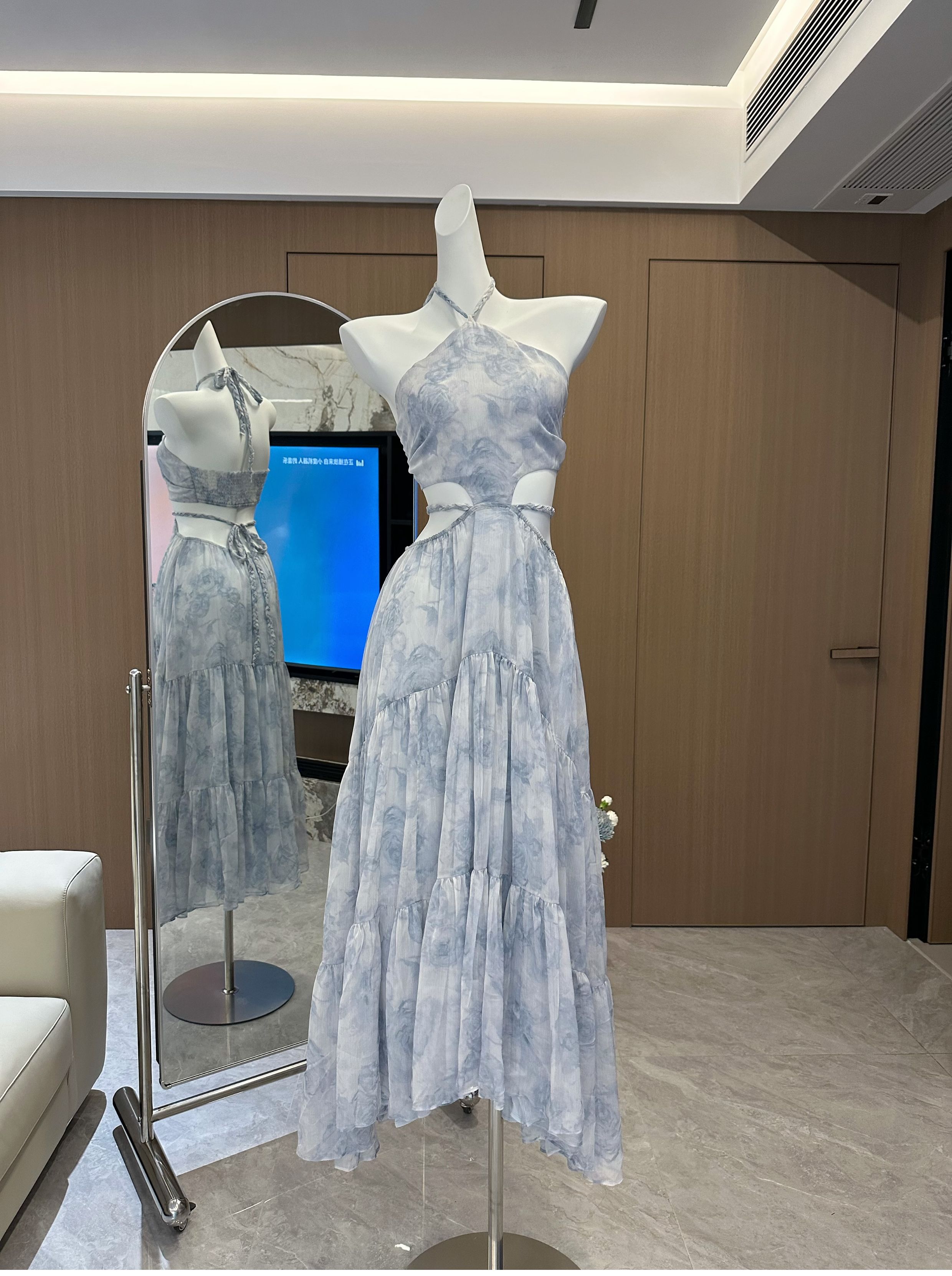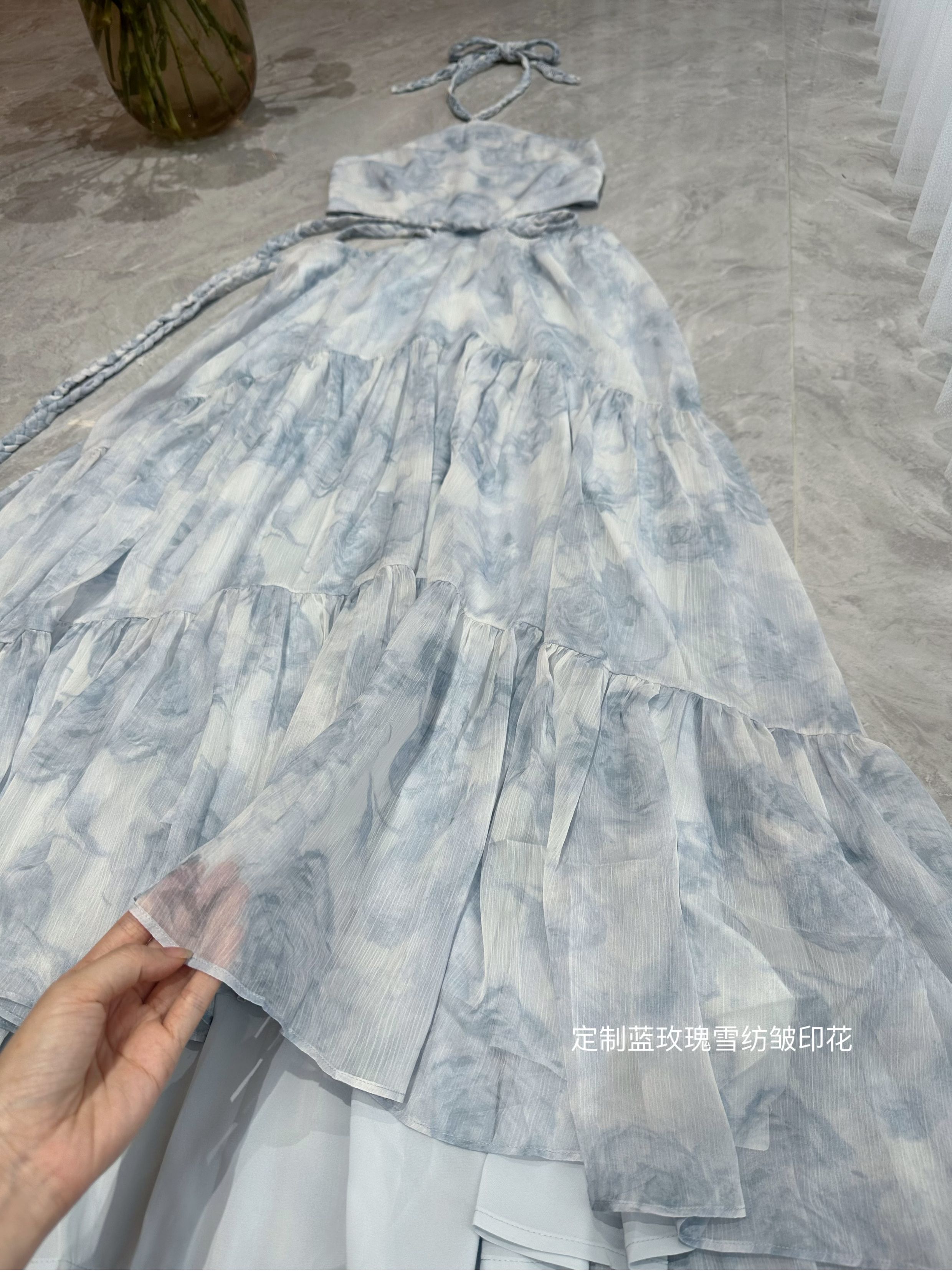 Youni Blue Rose Print Handmade Twist Braided Rope Waist-Revealing Sexy Elegant Petite Long Dress for Women in Summer