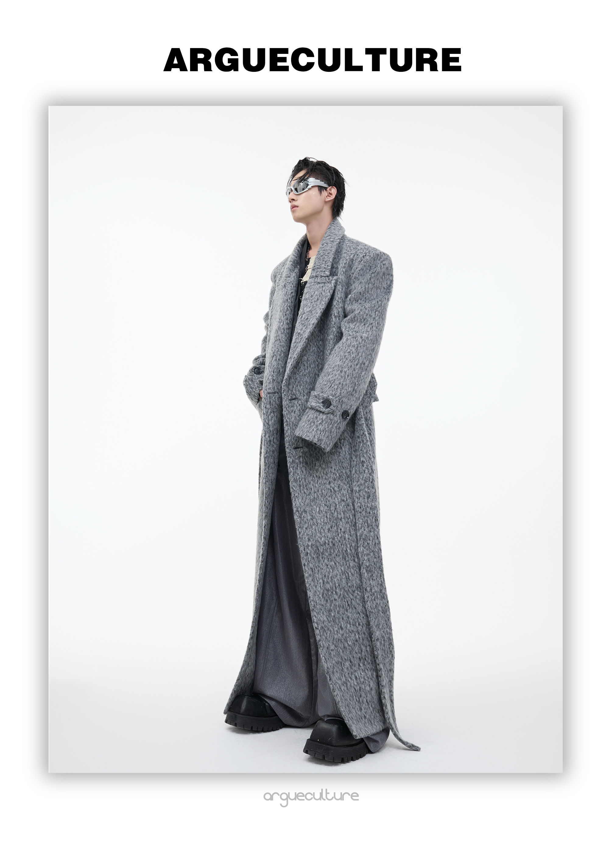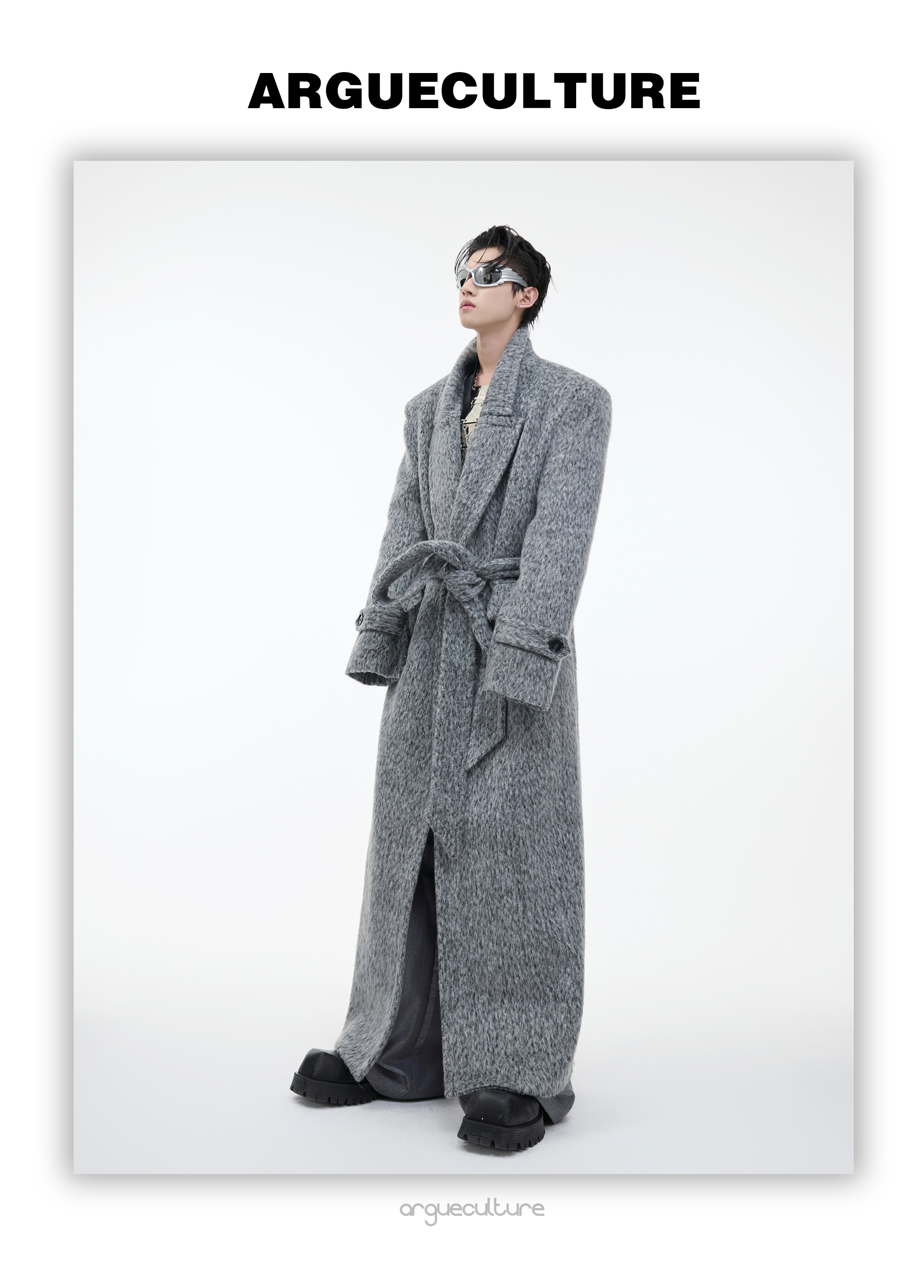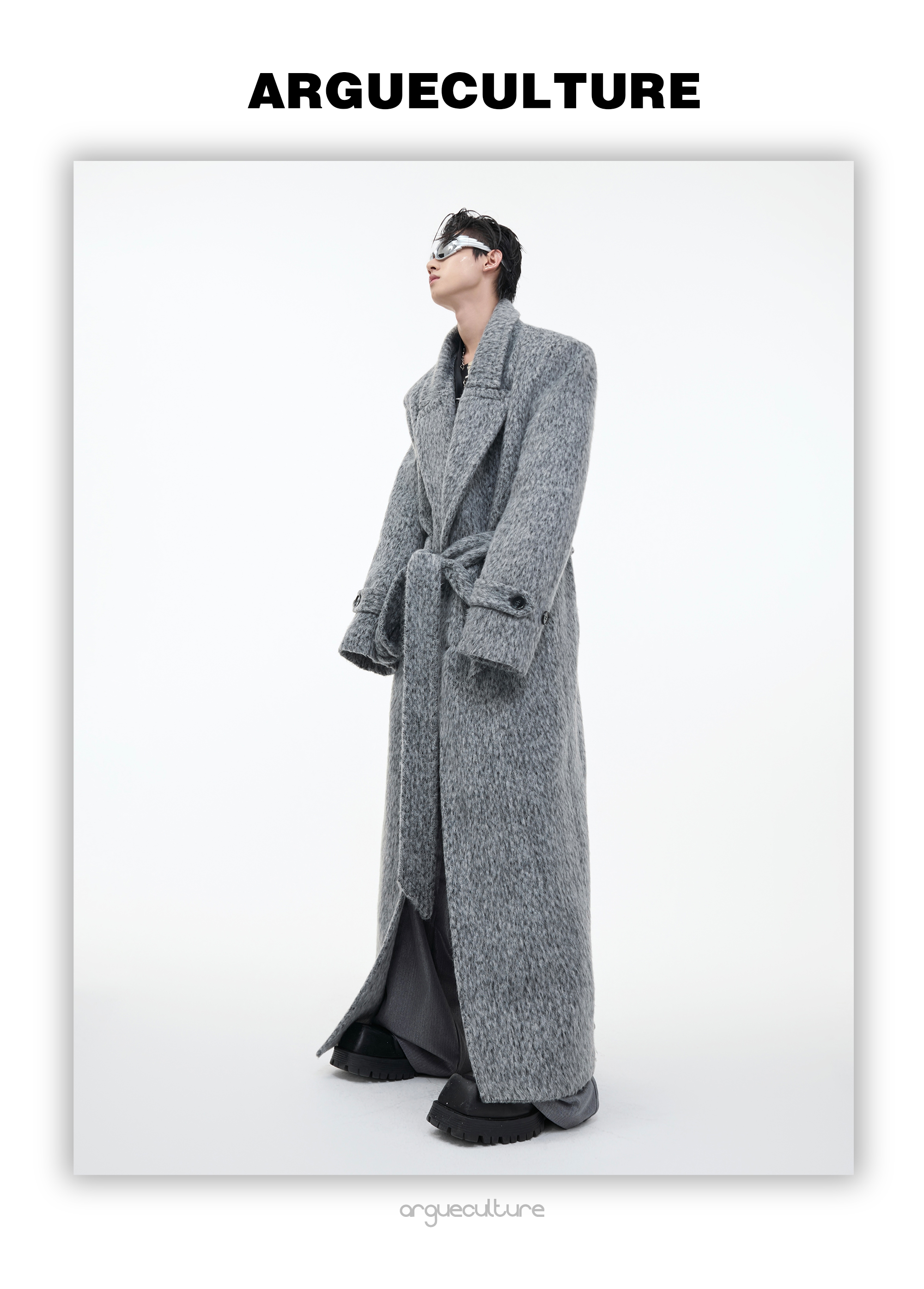 Culture Autumn and Winter Niche Plush Silhouette Wide-Shoulder Woolen Coat Heavy Loose Tie Waist Long Trench Coat