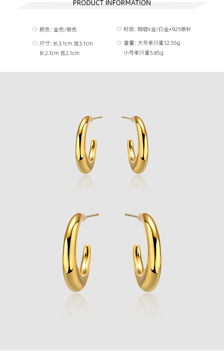 Boonee Alus Smooth Gold Hoop Earrings with Silver Posts, High-End Simple Plain Earrings, Elegant Women's Earrings