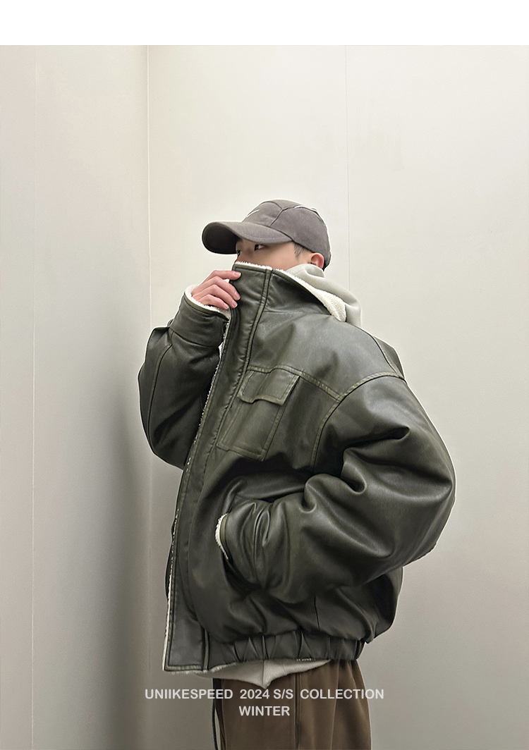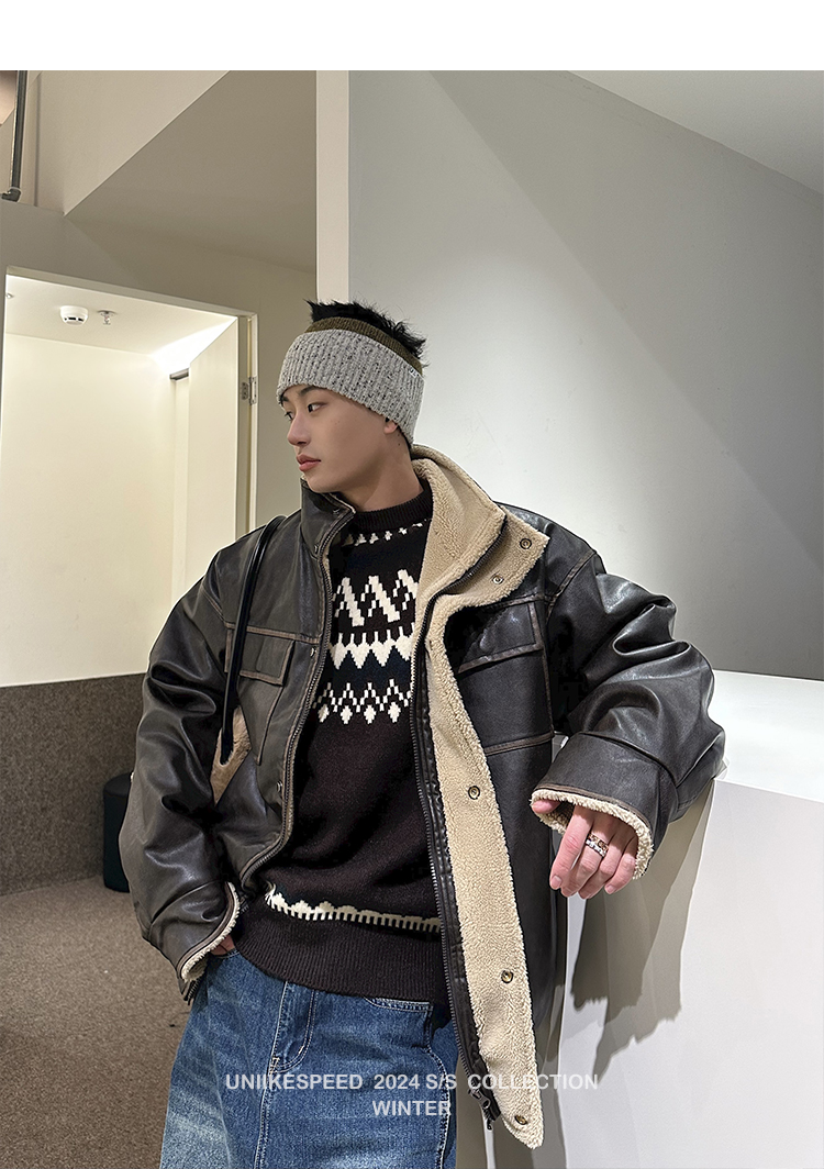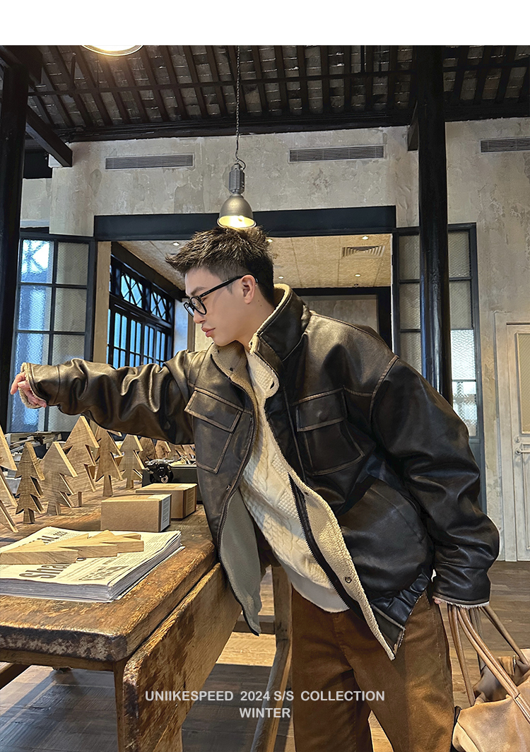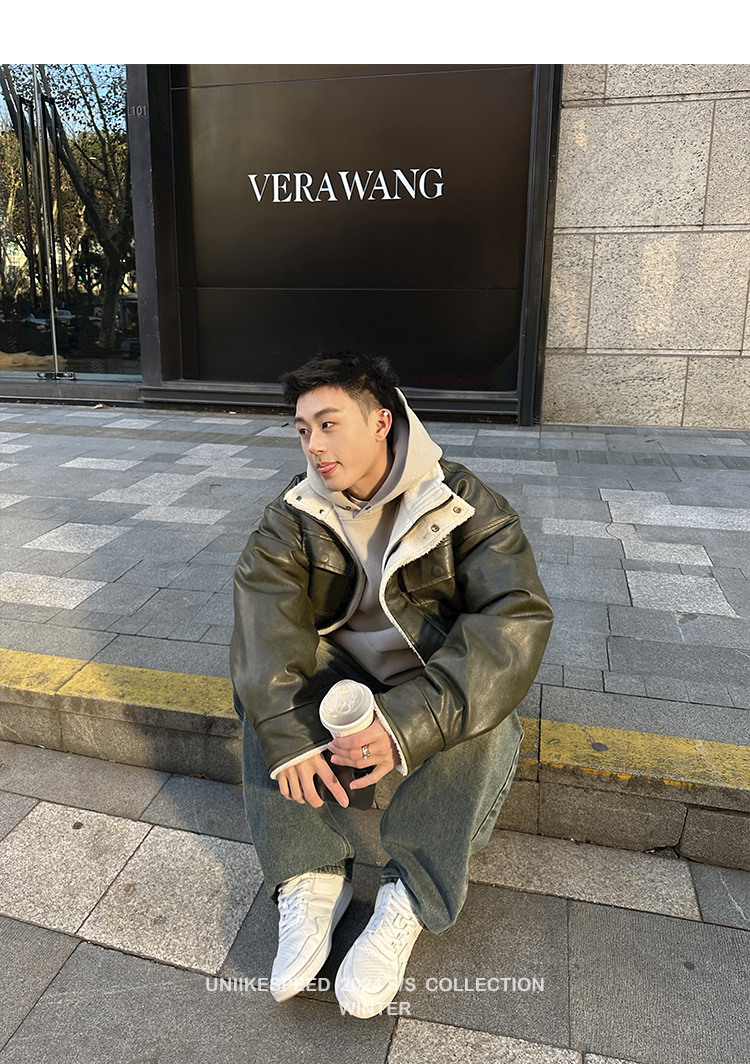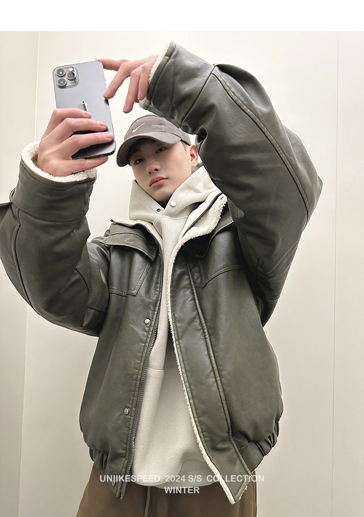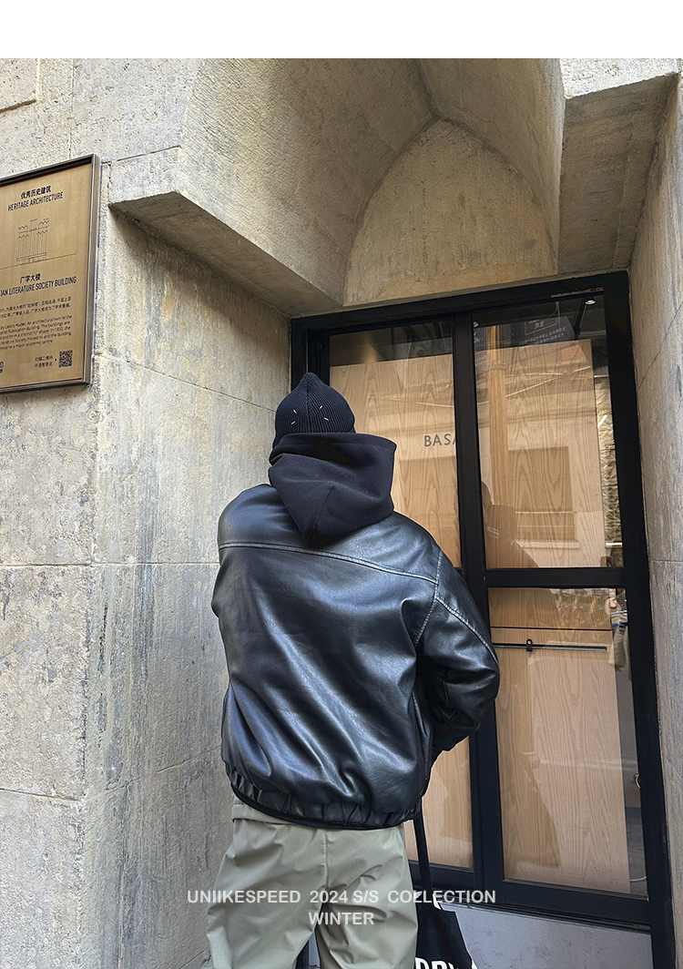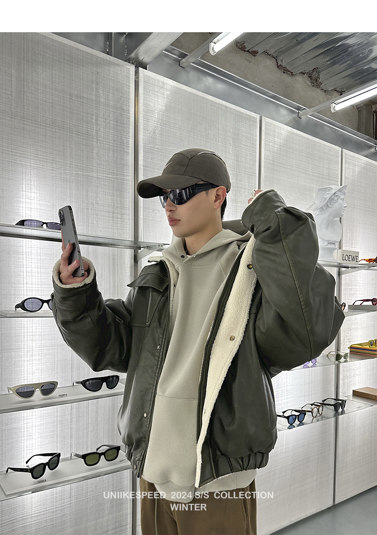 皮质的衣服本身就特别防风,内里全部都是厚实的羊羔毛,足够扎实!