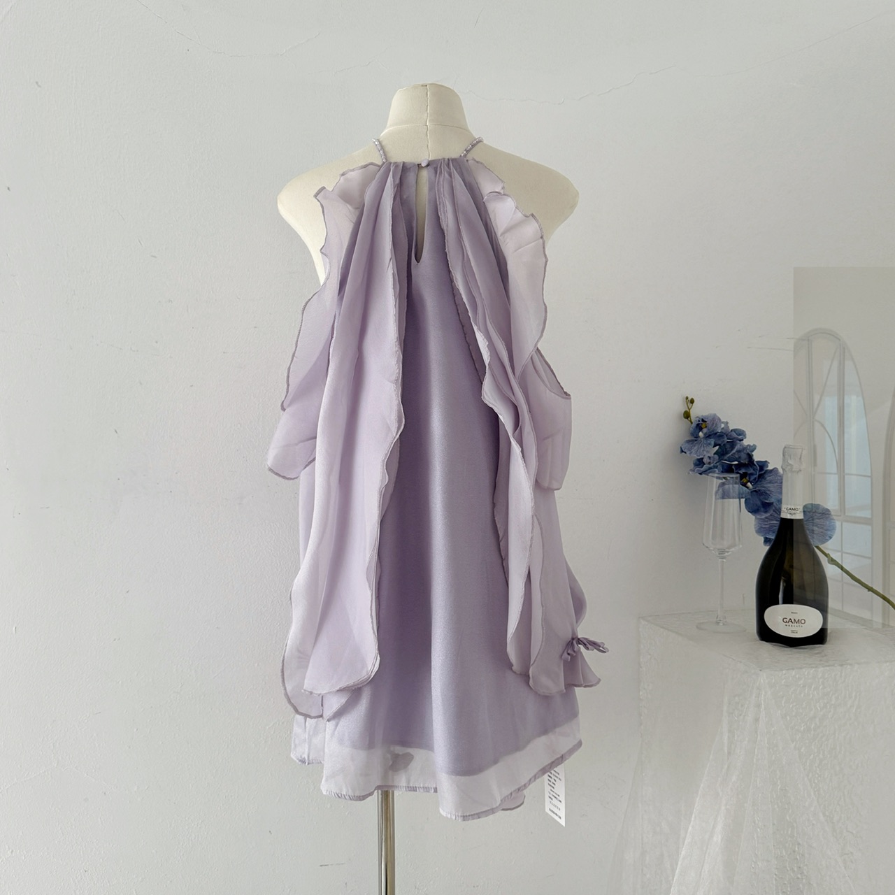 Youni LAOSHU “Princess Diary” Purple Halter Neck Dress with Three-Dimensional Flowers, Off-Shoulder, Elegant Short Dress for Women