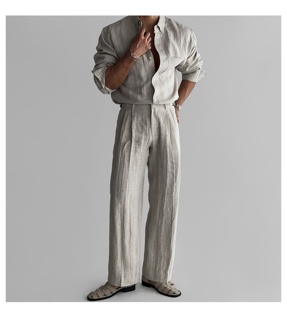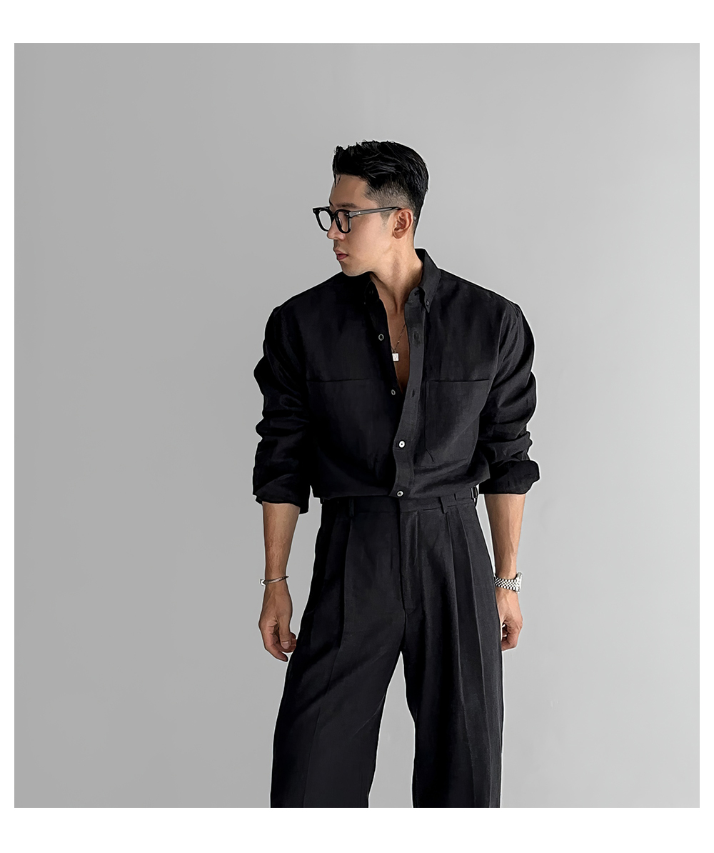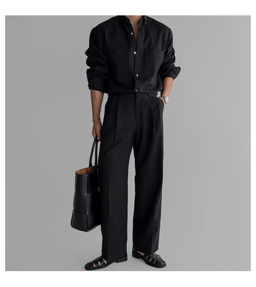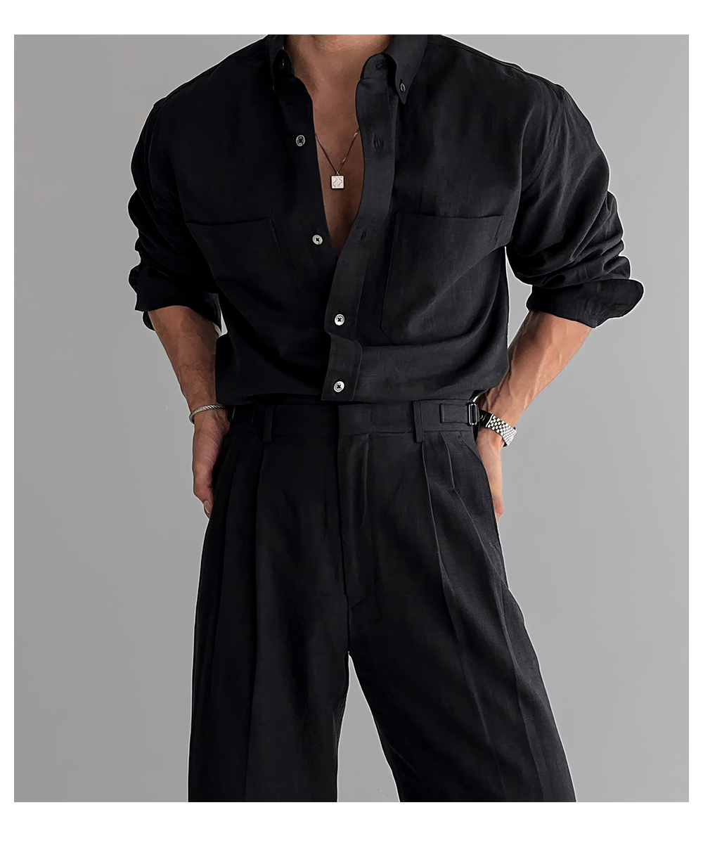 Black Linen Long-Sleeved Sun Protection Shirt Suit for Men, Autumn Korean Style, Lightweight and Breathable Shirt, Straight-Leg Casual Trousers