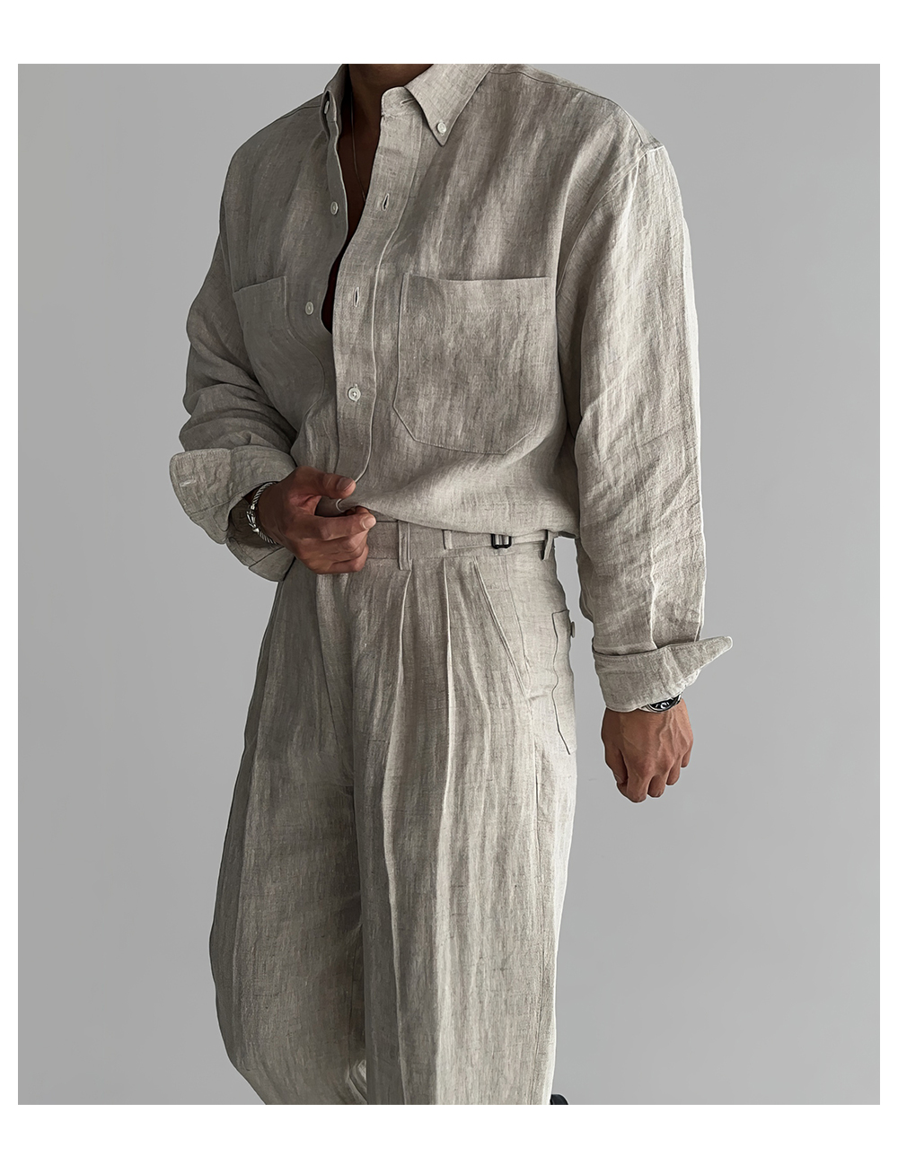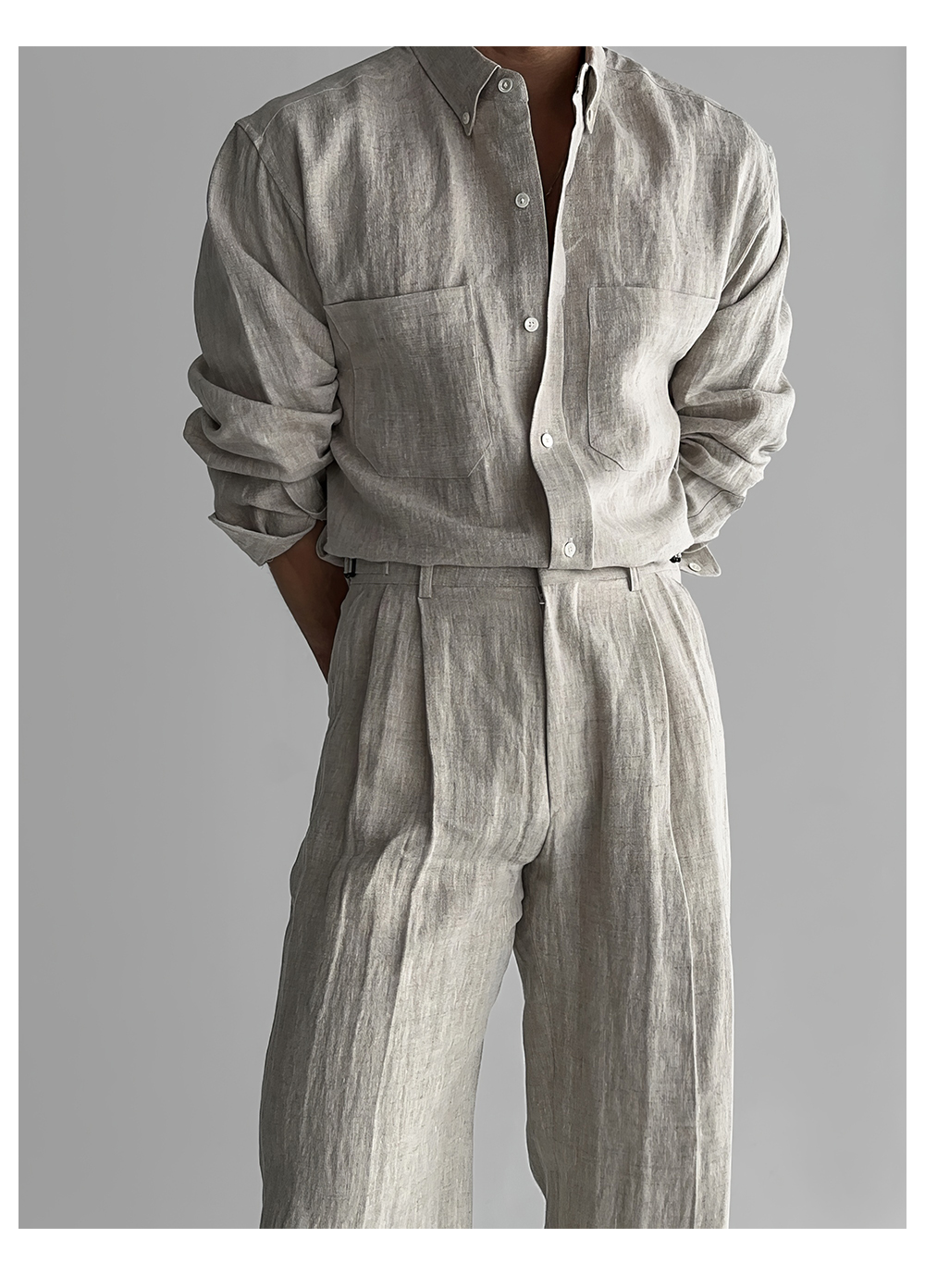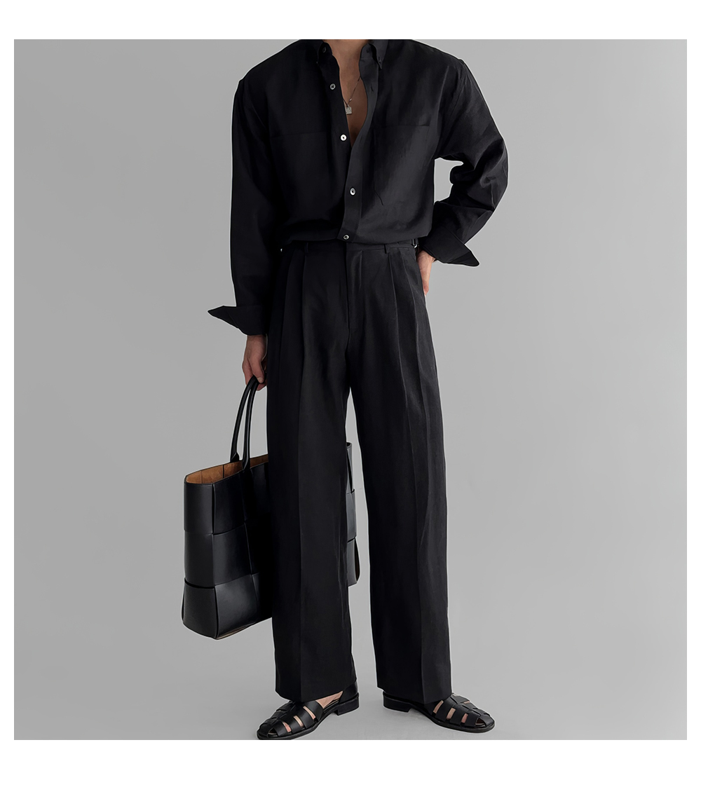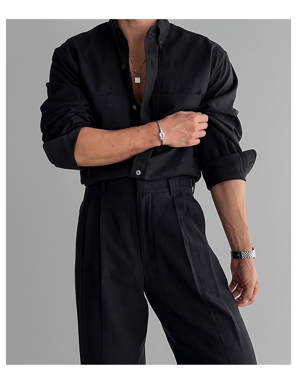 Black Linen Long-Sleeved Sun Protection Shirt Suit for Men, Autumn Korean Style, Lightweight and Breathable Shirt, Straight-Leg Casual Trousers