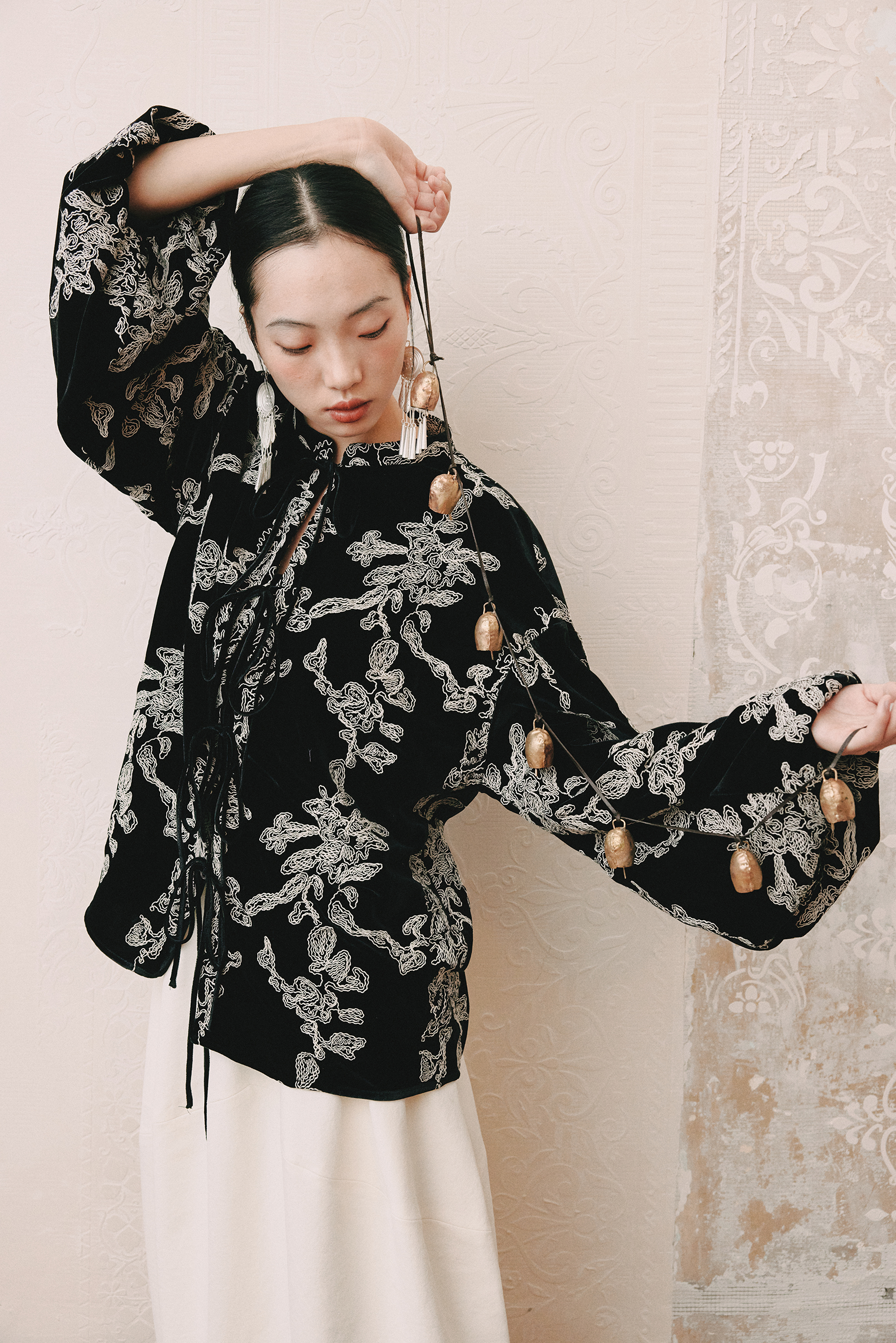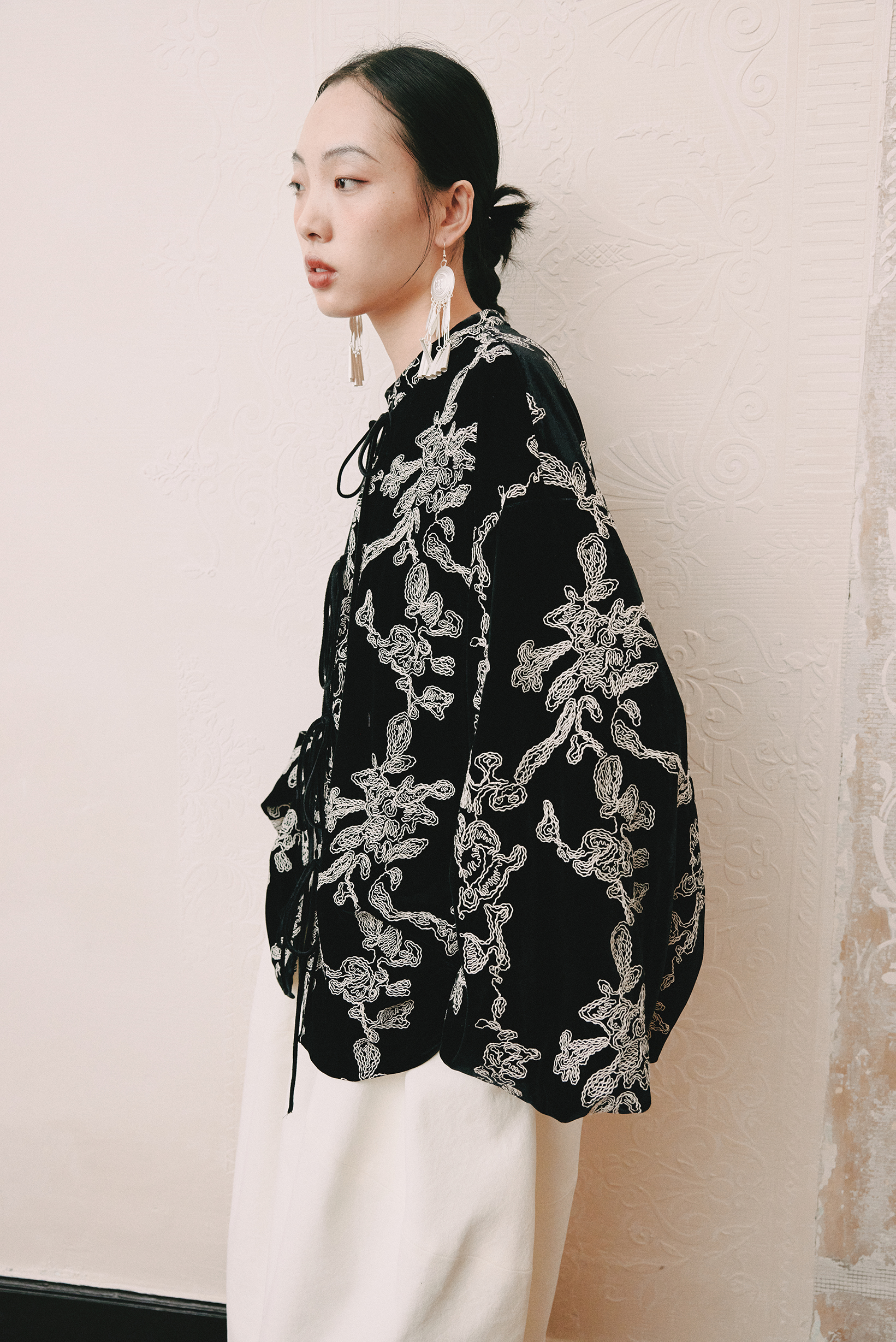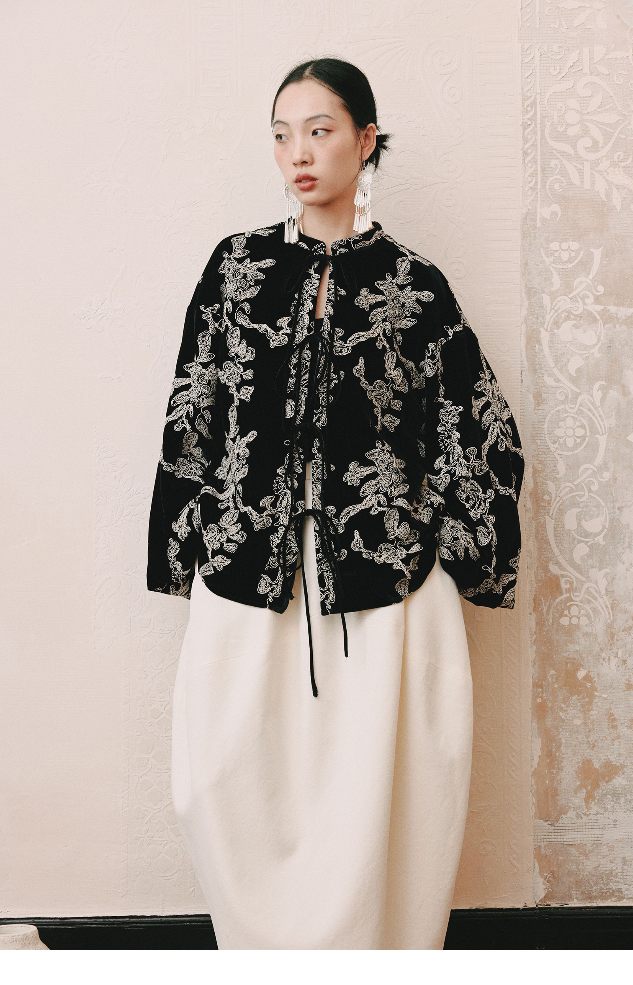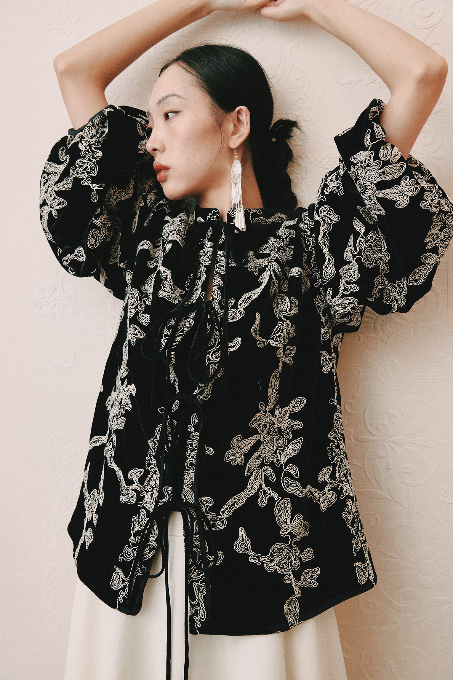 Yuanye Original New Chinese-Style Black Velvet Embroidered Stand-Up Collar Tie Lantern Sleeve Jacket