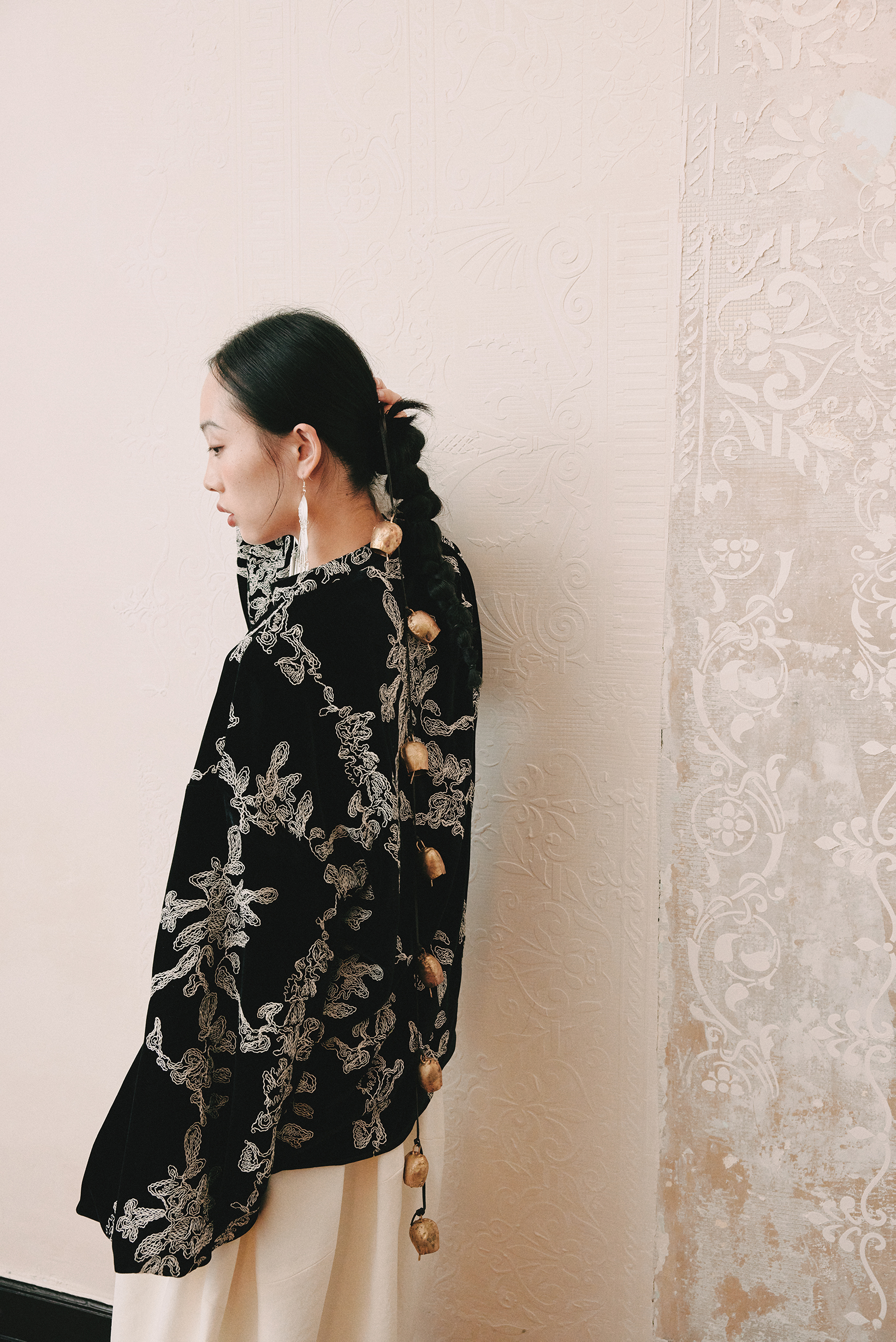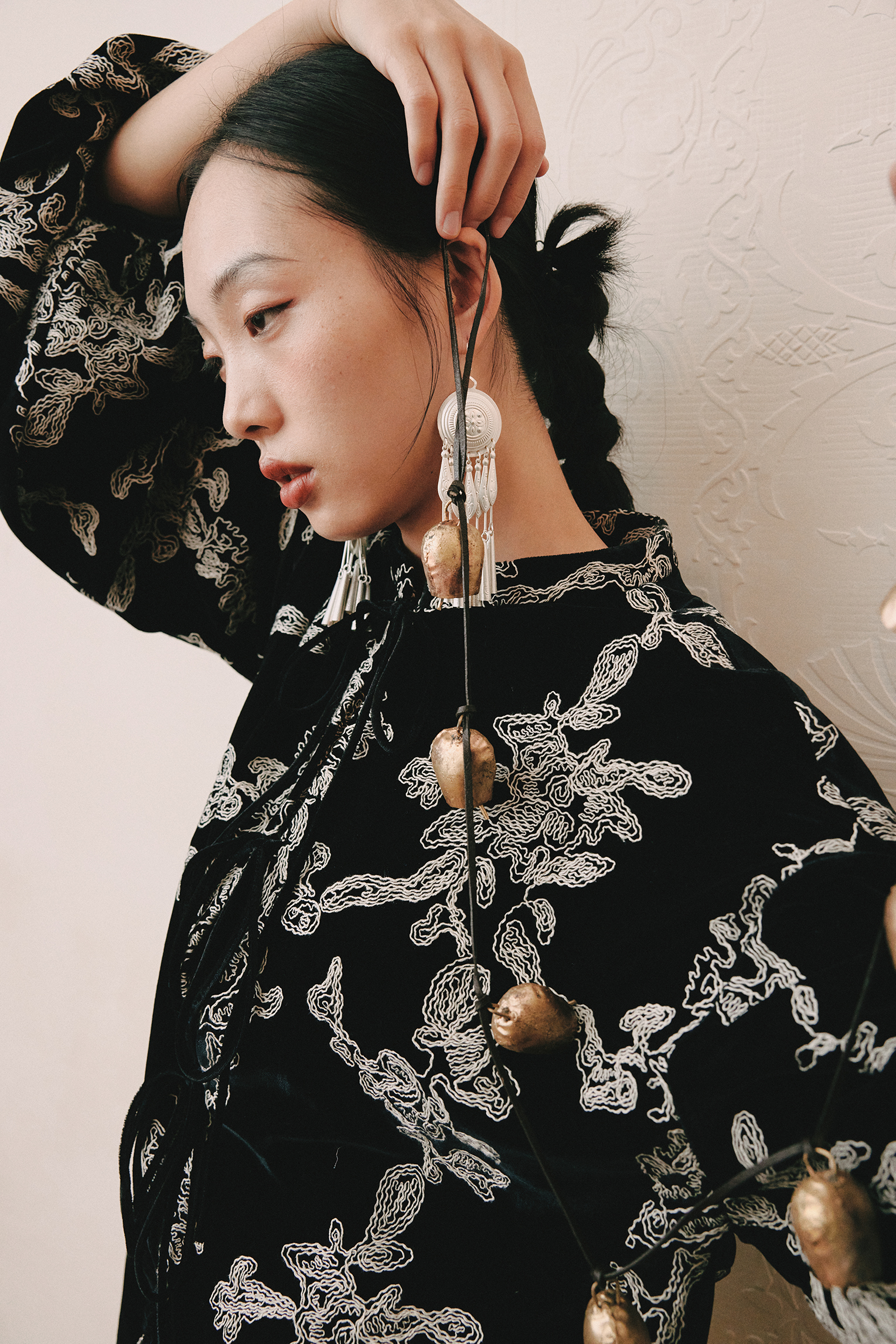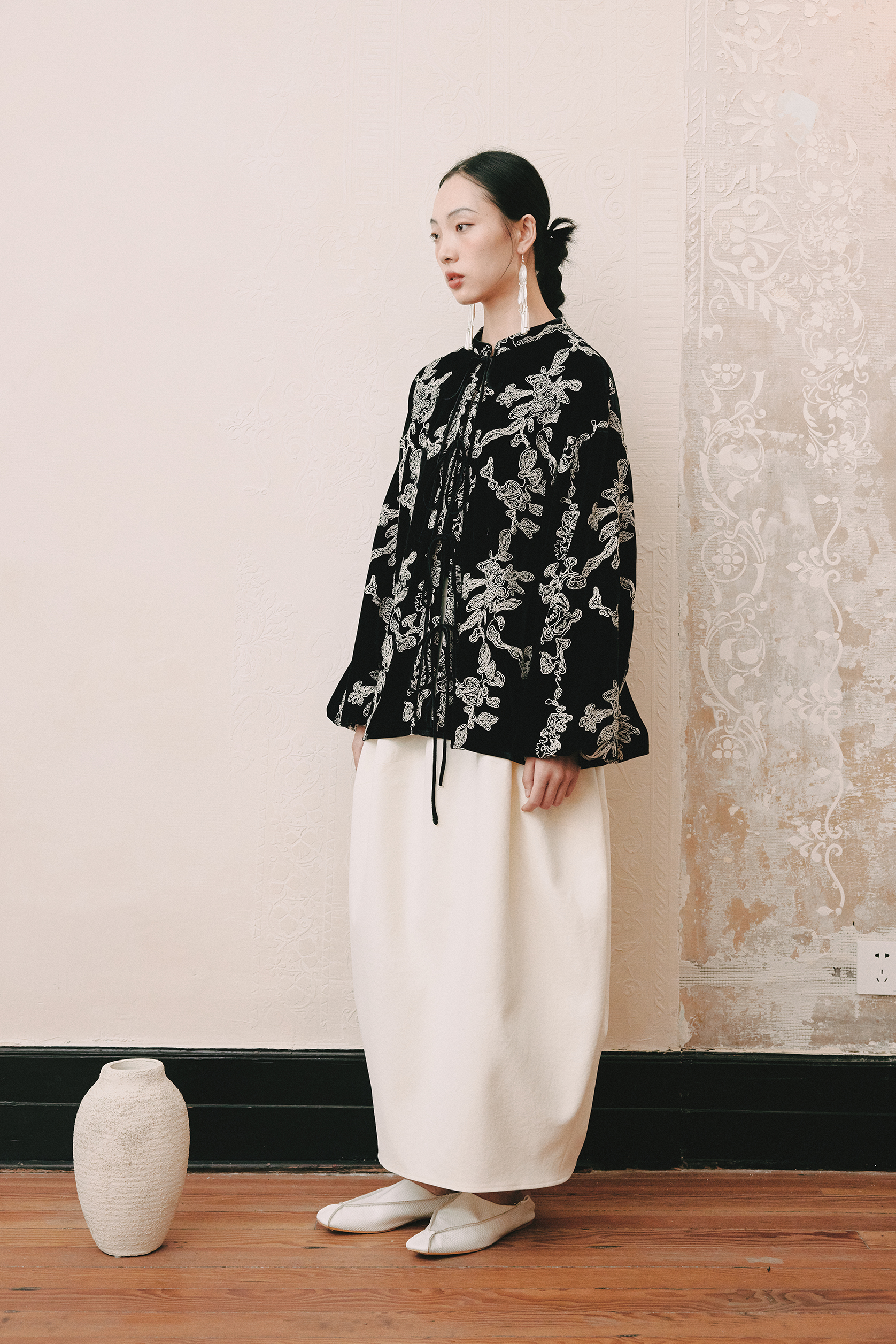 Yuanye Original New Chinese-Style Black Velvet Embroidered Stand-Up Collar Tie Lantern Sleeve Jacket